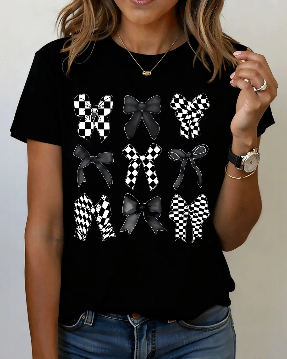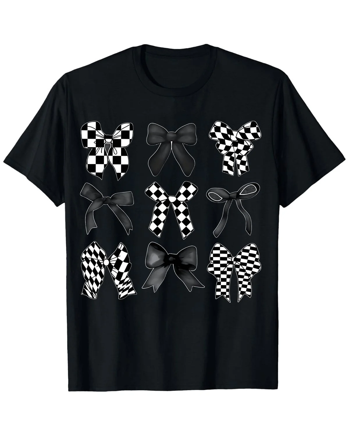 Black and White Checkered Bow Patterns Summer Cotton Graphic T Shirt-Vintage Chic,Short Sleeve,Soft Fabric,Comfortable Fit