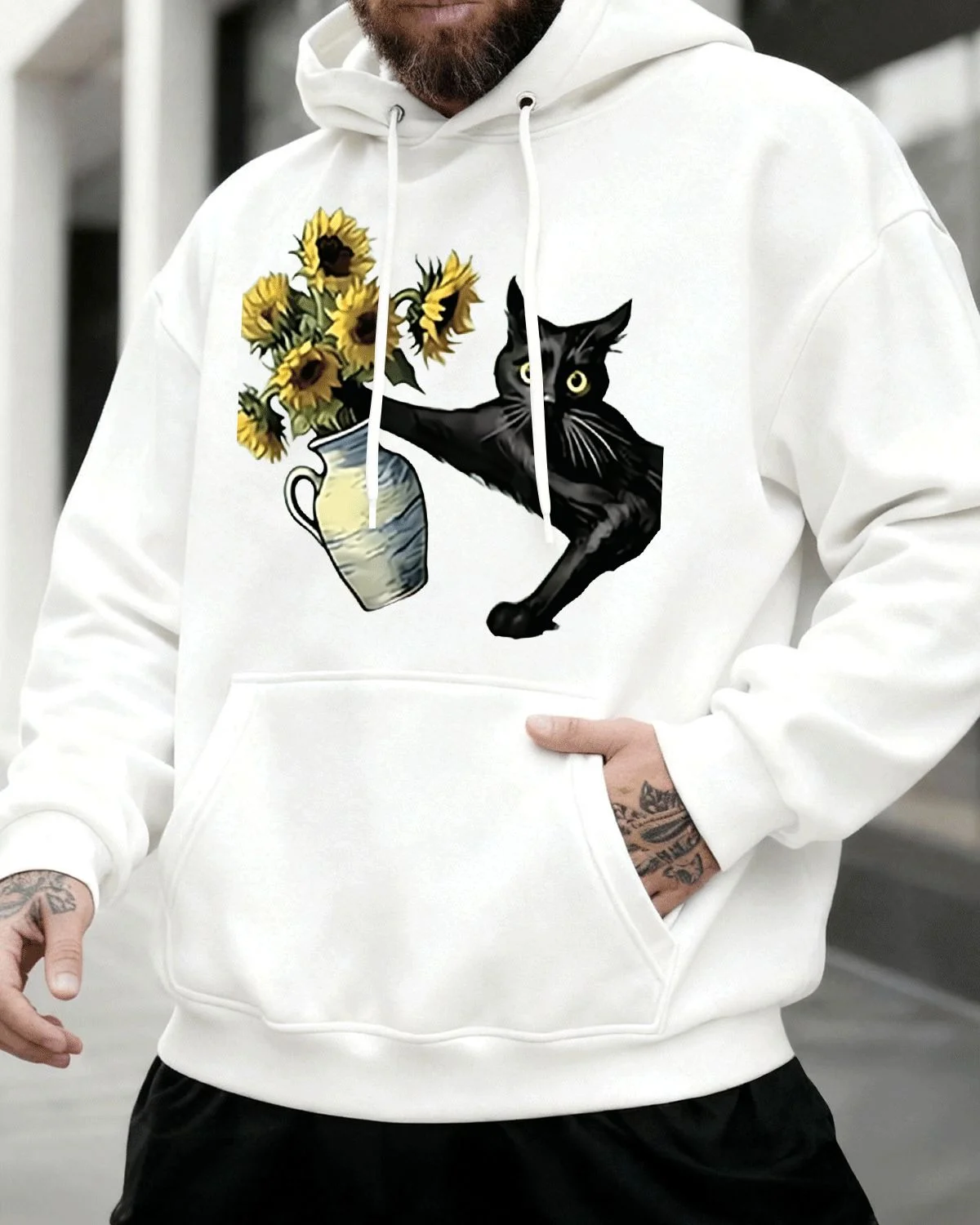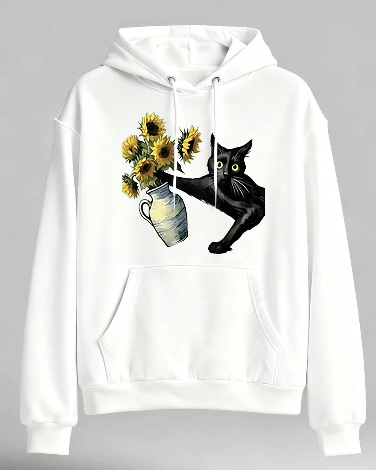 Black Cat with Sunflowers Cozy Graphic Hoodie for Men and Women - Casual Artistic, Long Sleeve, Soft Fabric, Comfortable Fit