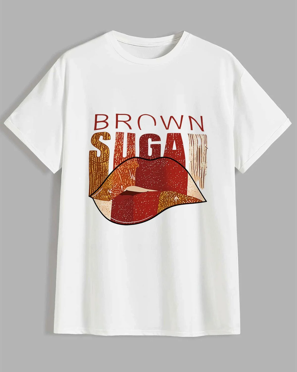Brown Sugar Lips Summer Cotton Graphic T Shirt - Casual Retro,Short Sleeve,Soft Fabric,Comfortable Fit