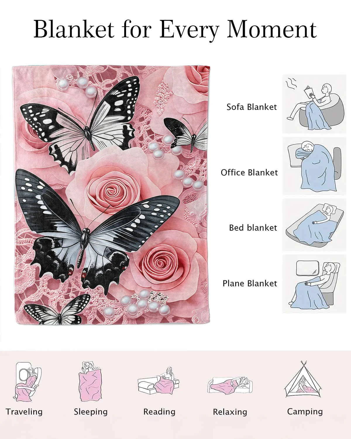 Butterfly and Rose Love Gift Cozy Flannel Blanket-Elegant Cute,Plush,Warm,Super Soft,For Bed,Living Room Use