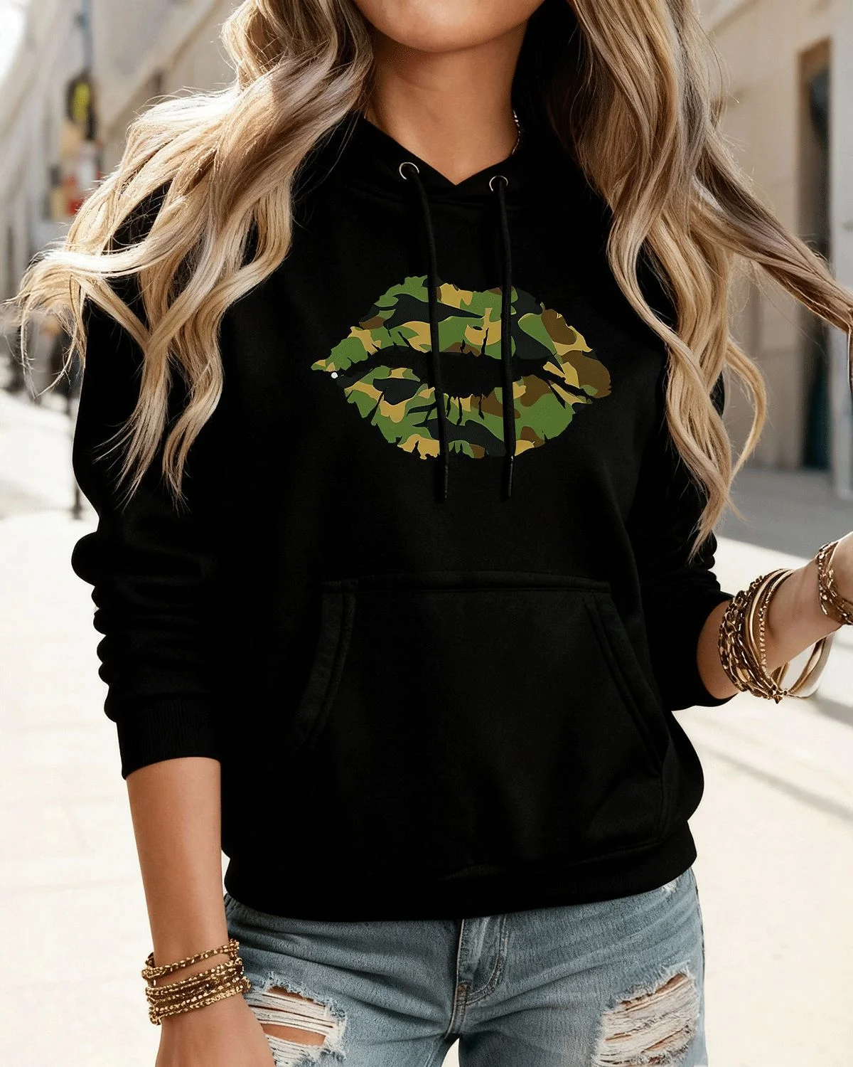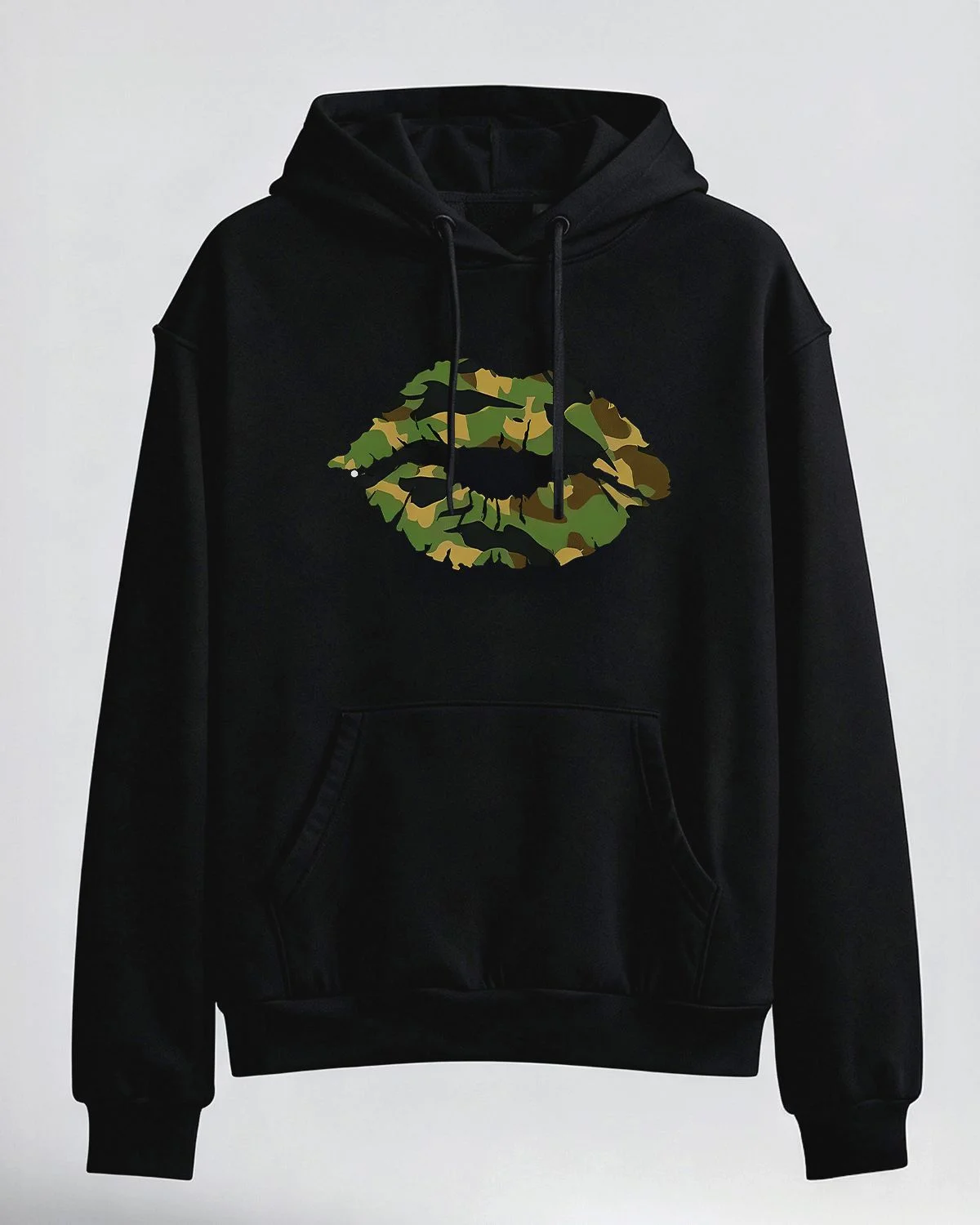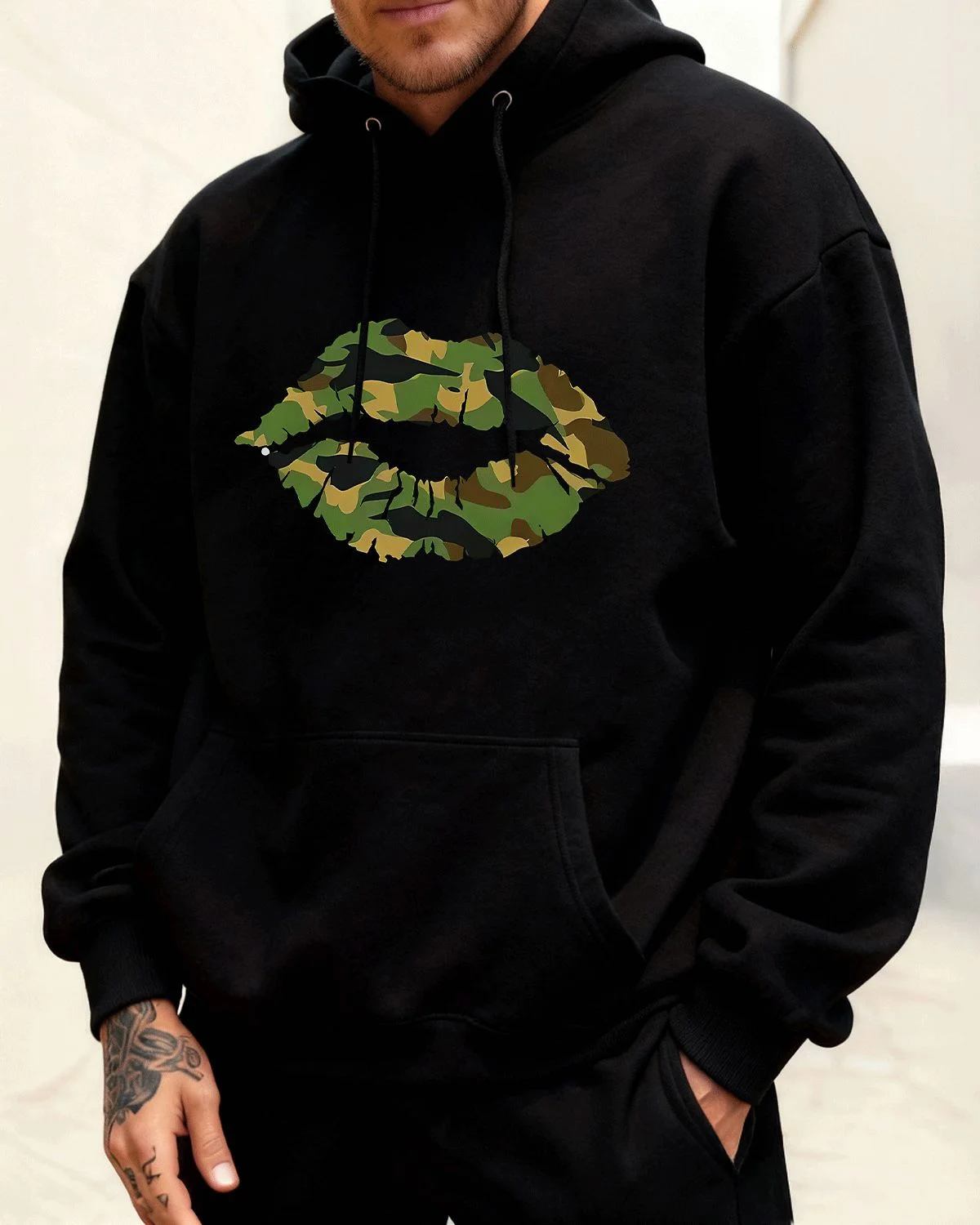 Camouflage Lip Print Cozy Cotton Graphic Hoodie with Pocket - Casual Trendy,Long Sleeve,Soft Fabric,Comfortable Fit
