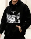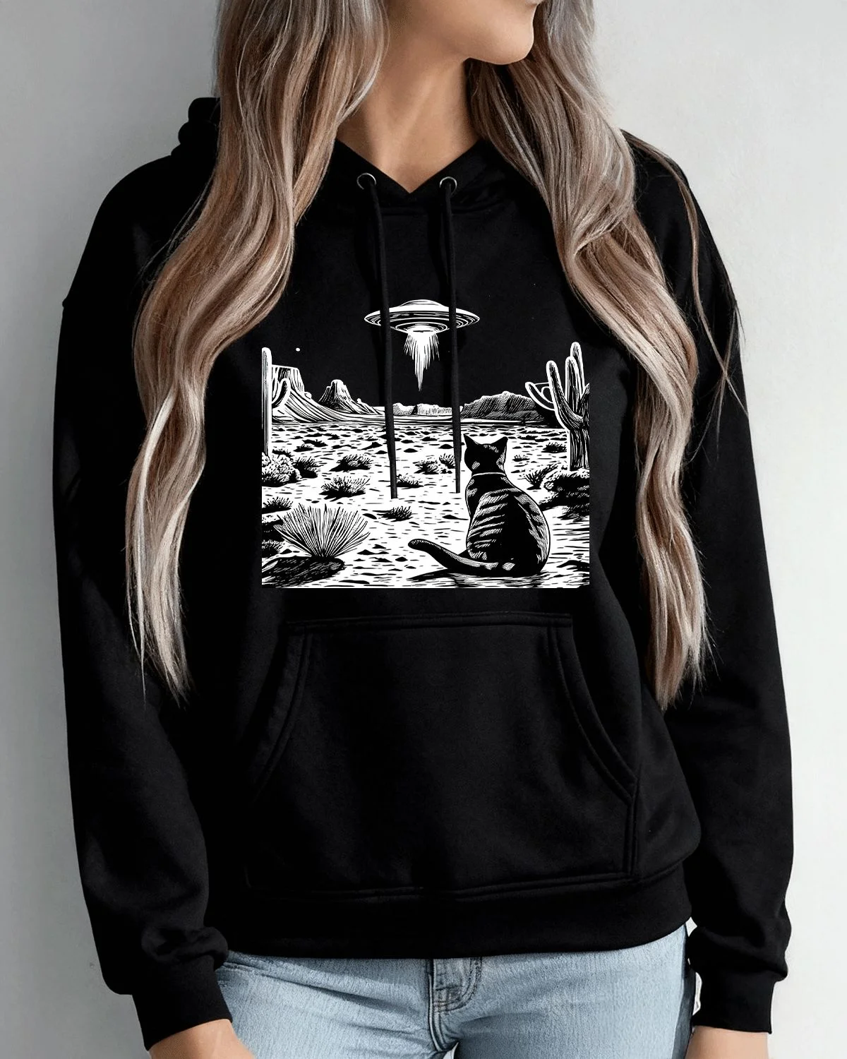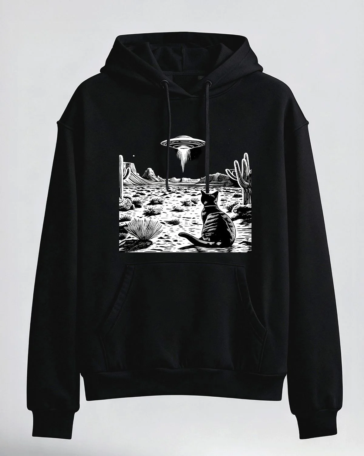 Cat Watching UFO in Desert Cozy Graphic Hoodie for Men and Women - Artistic Vintage, Long Sleeve, Soft Fabric, Comfortable Fit