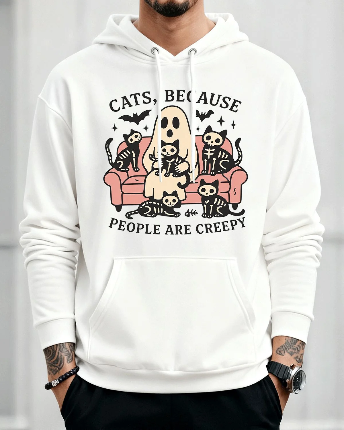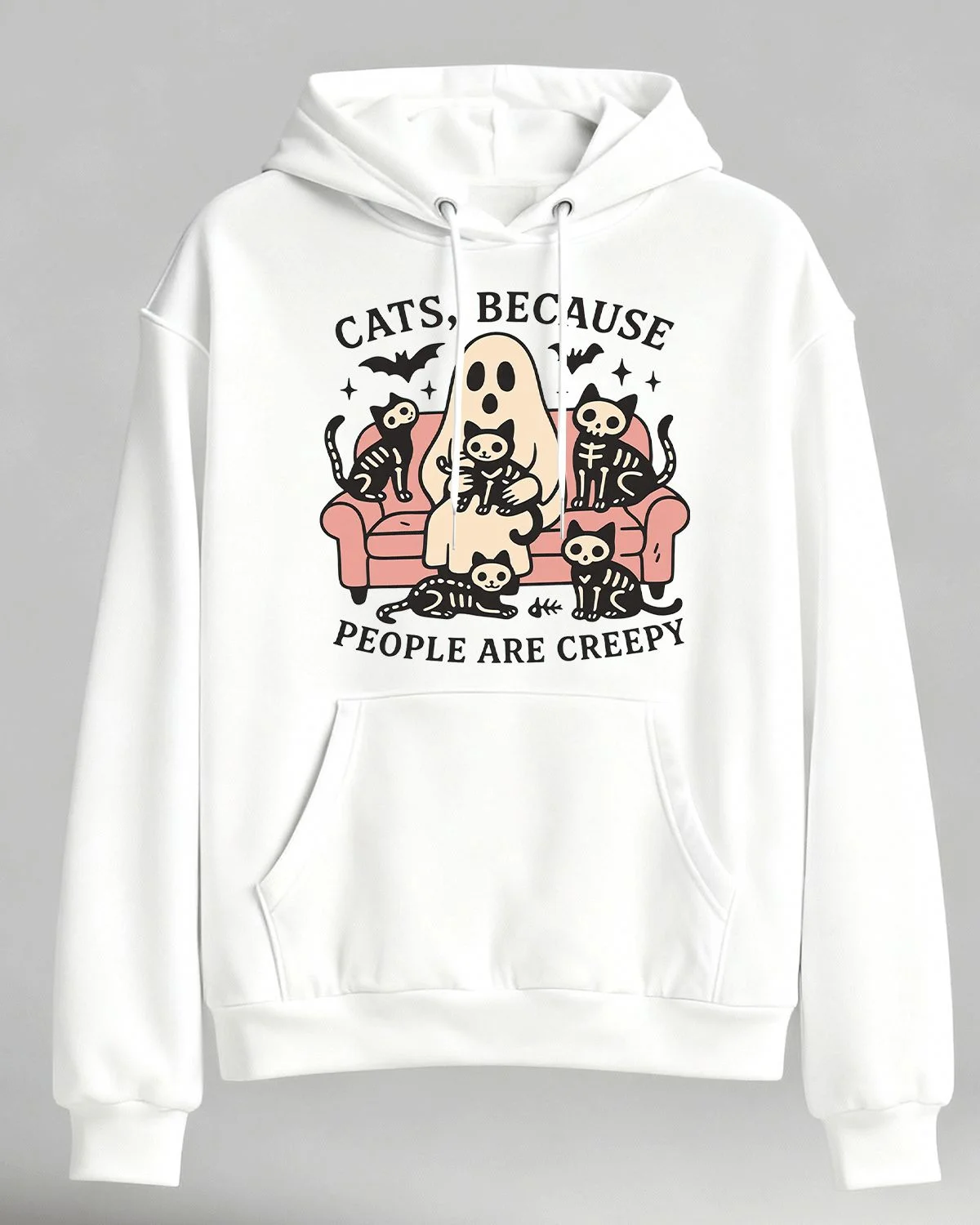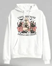 Cats Because People Are Creepy Ghost and Skeleton Cozy Graphic Hoodie for Men and Women - Funny Vintage, Long Sleeve, Soft Fabric, Comfortable Fit