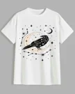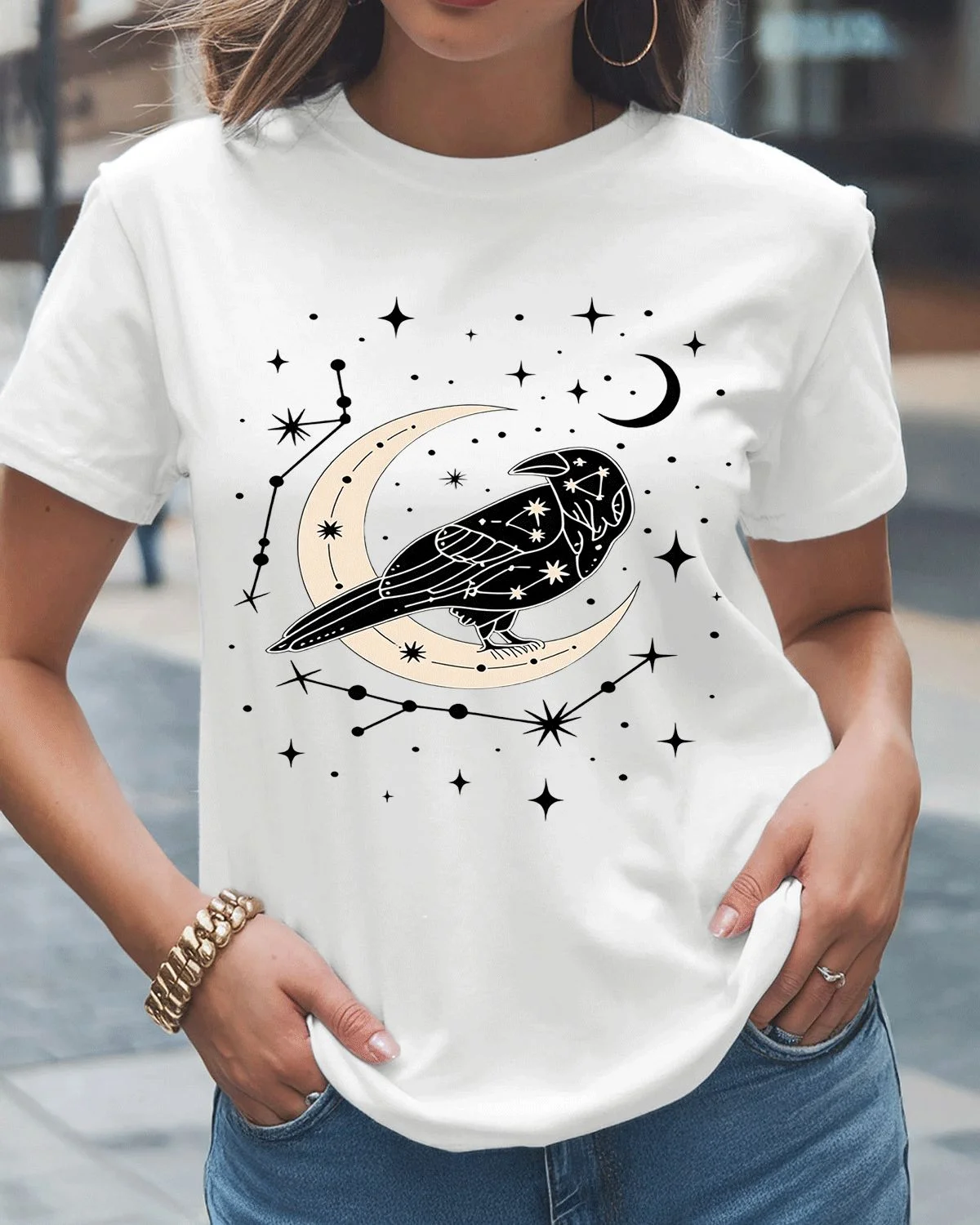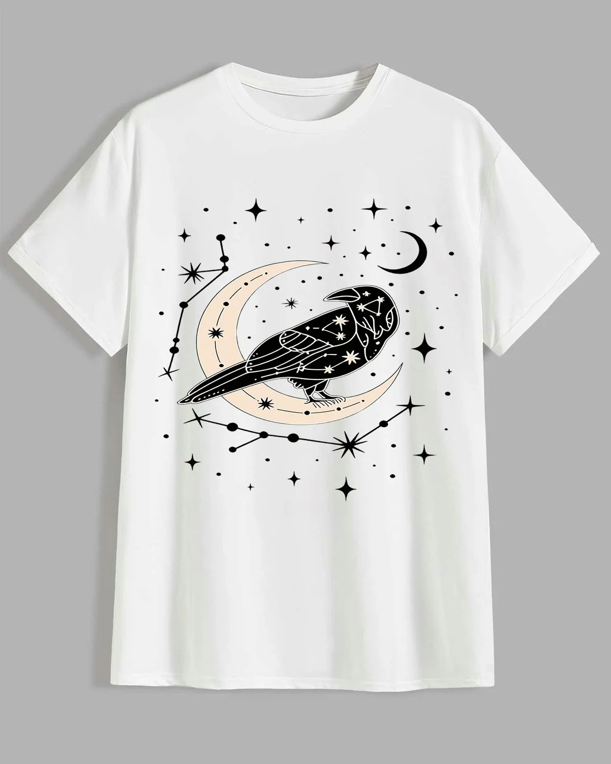 Celestial Raven and Crescent Moon Summer Cotton Graphic T Shirt - Artistic Vintage, Short Sleeve, Soft Fabric, Comfortable Fit
