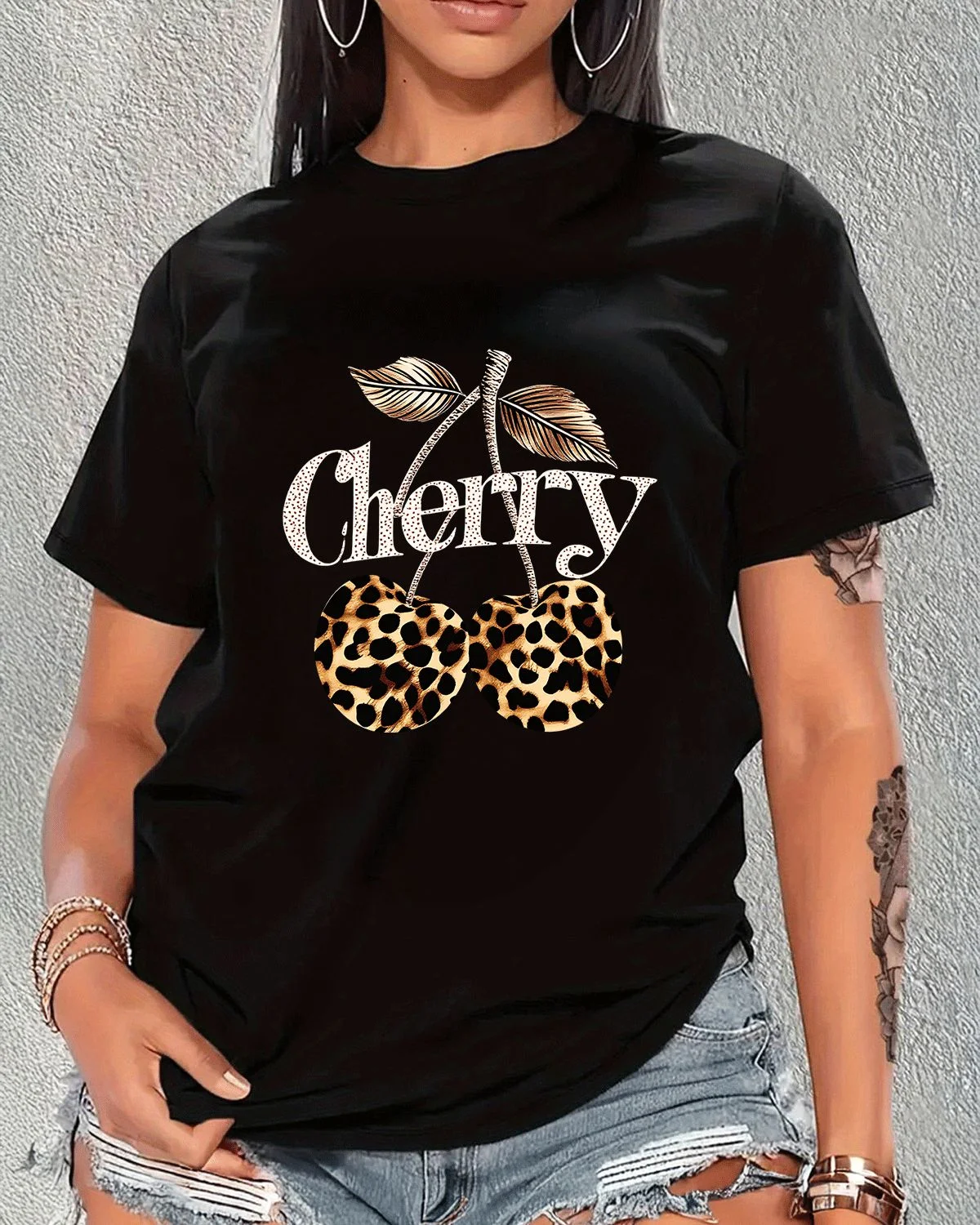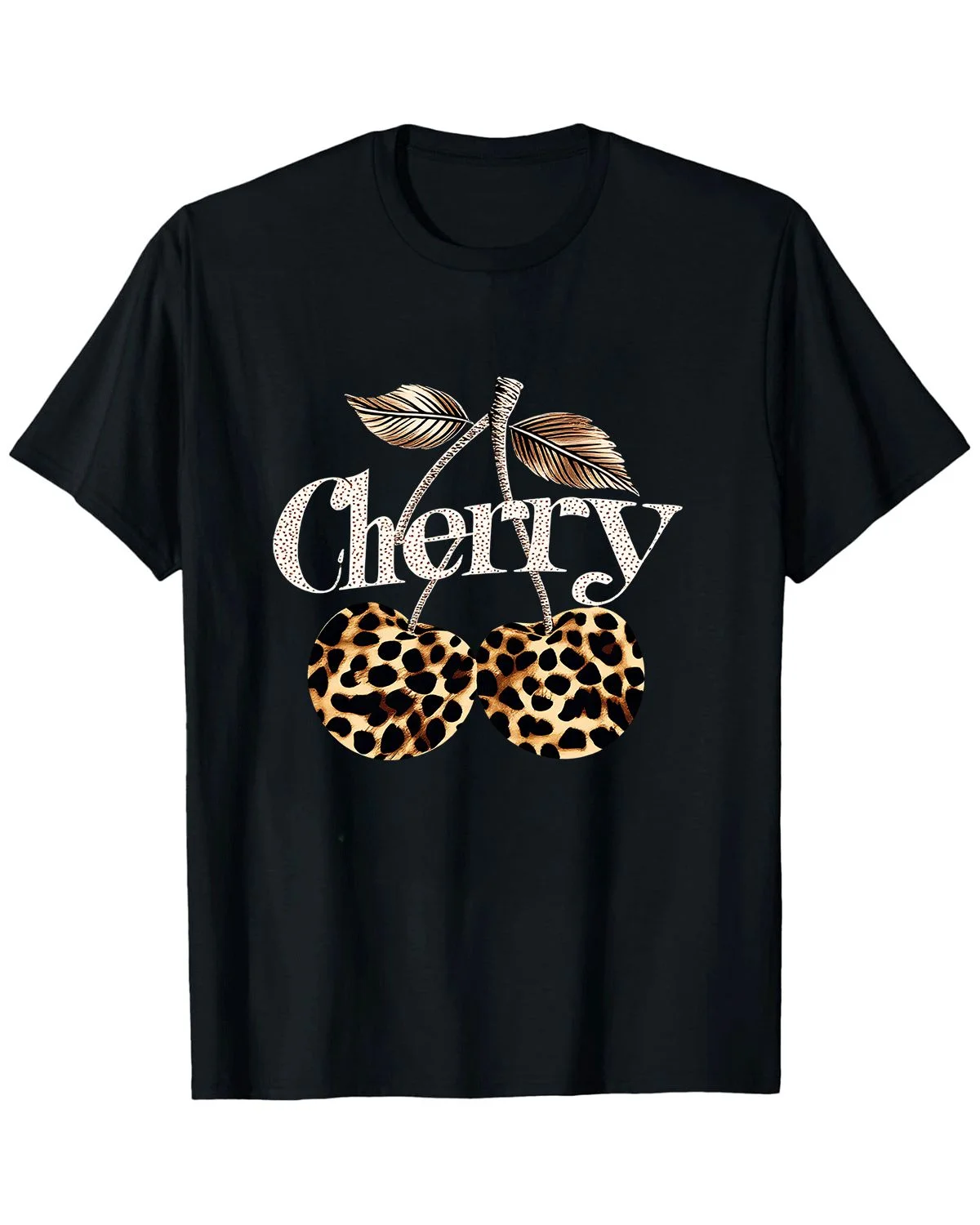 Cherry Leopard Print Summer Cotton Graphic T Shirt - Casual Trendy,Short Sleeve,Soft Fabric,Comfortable Fit