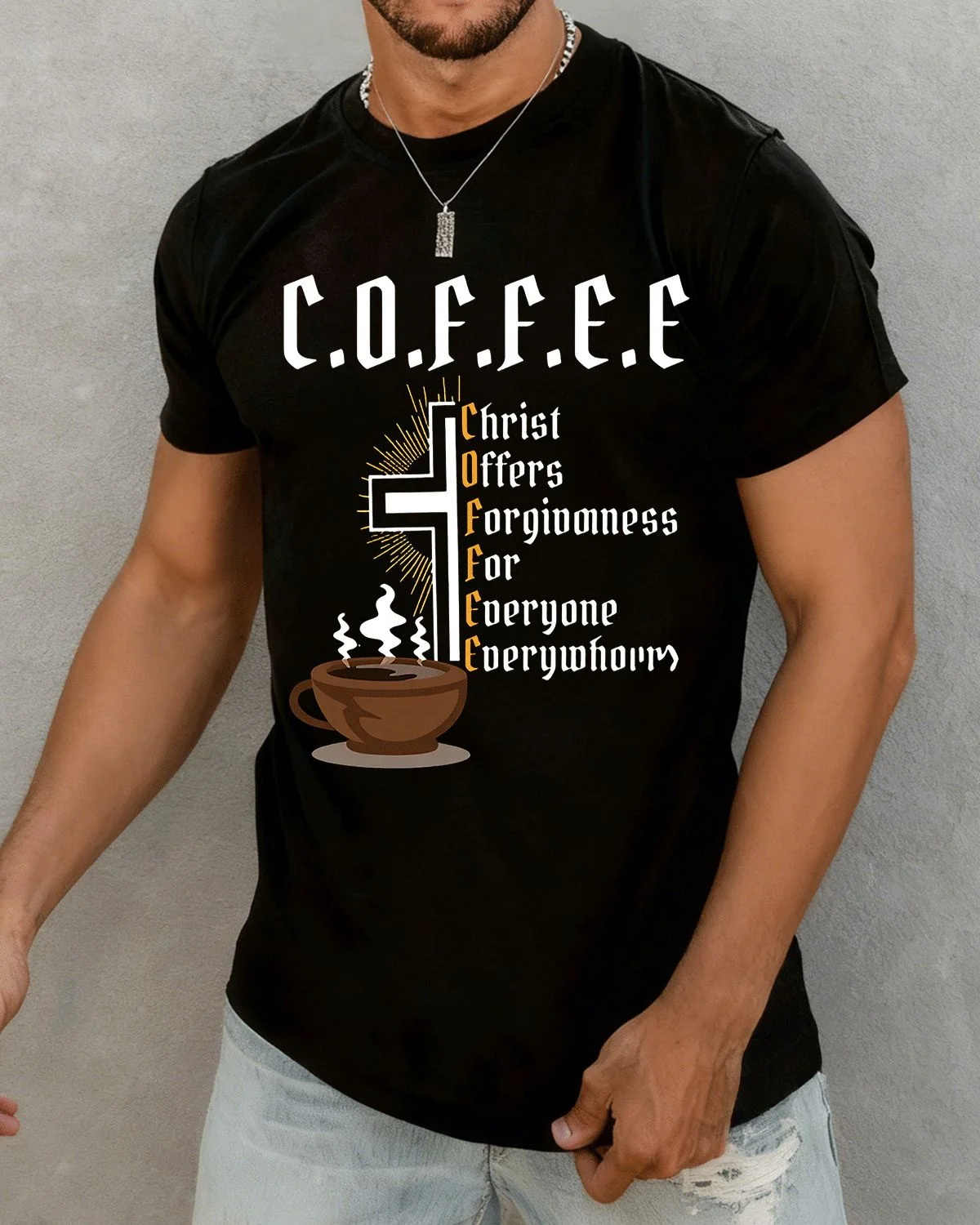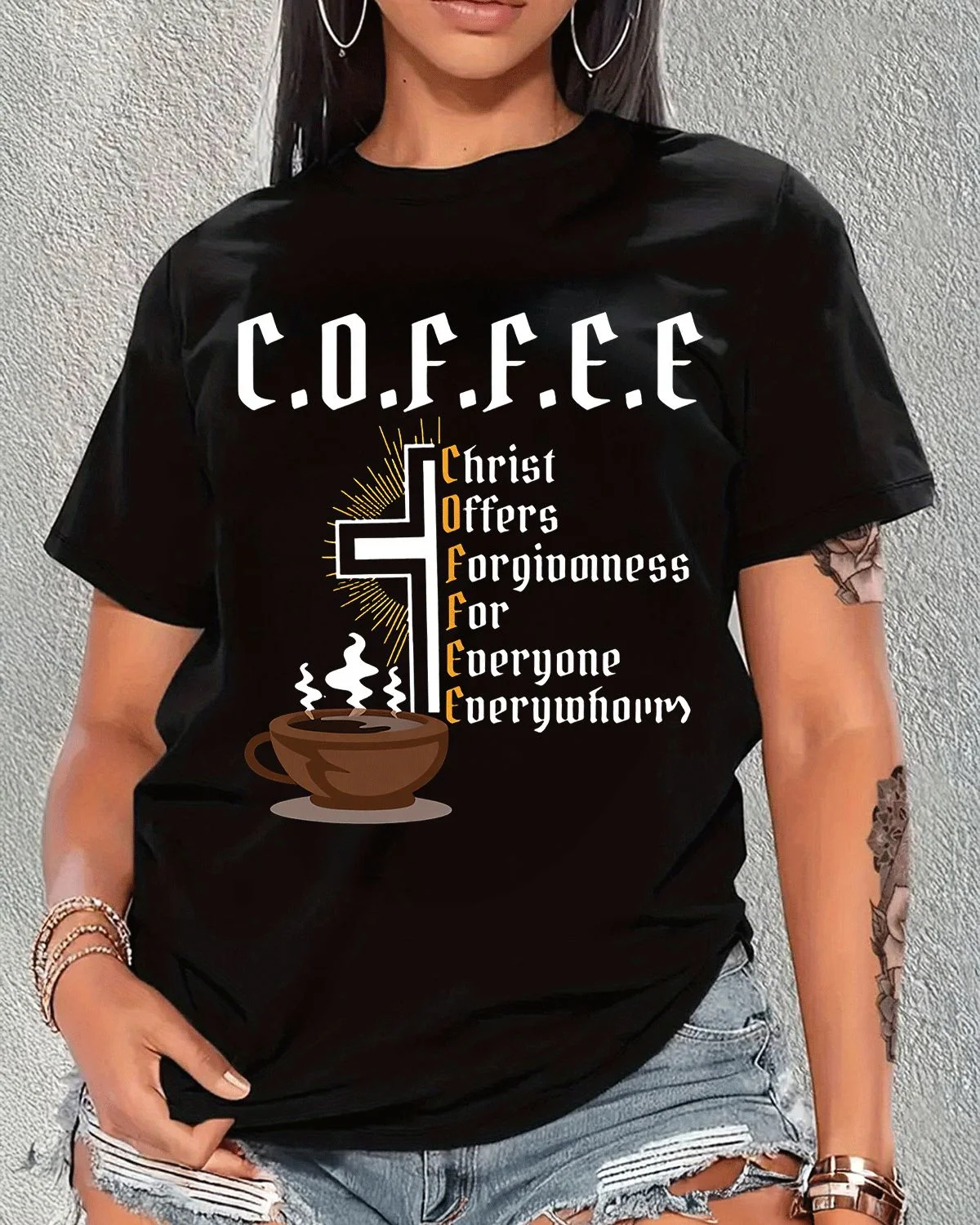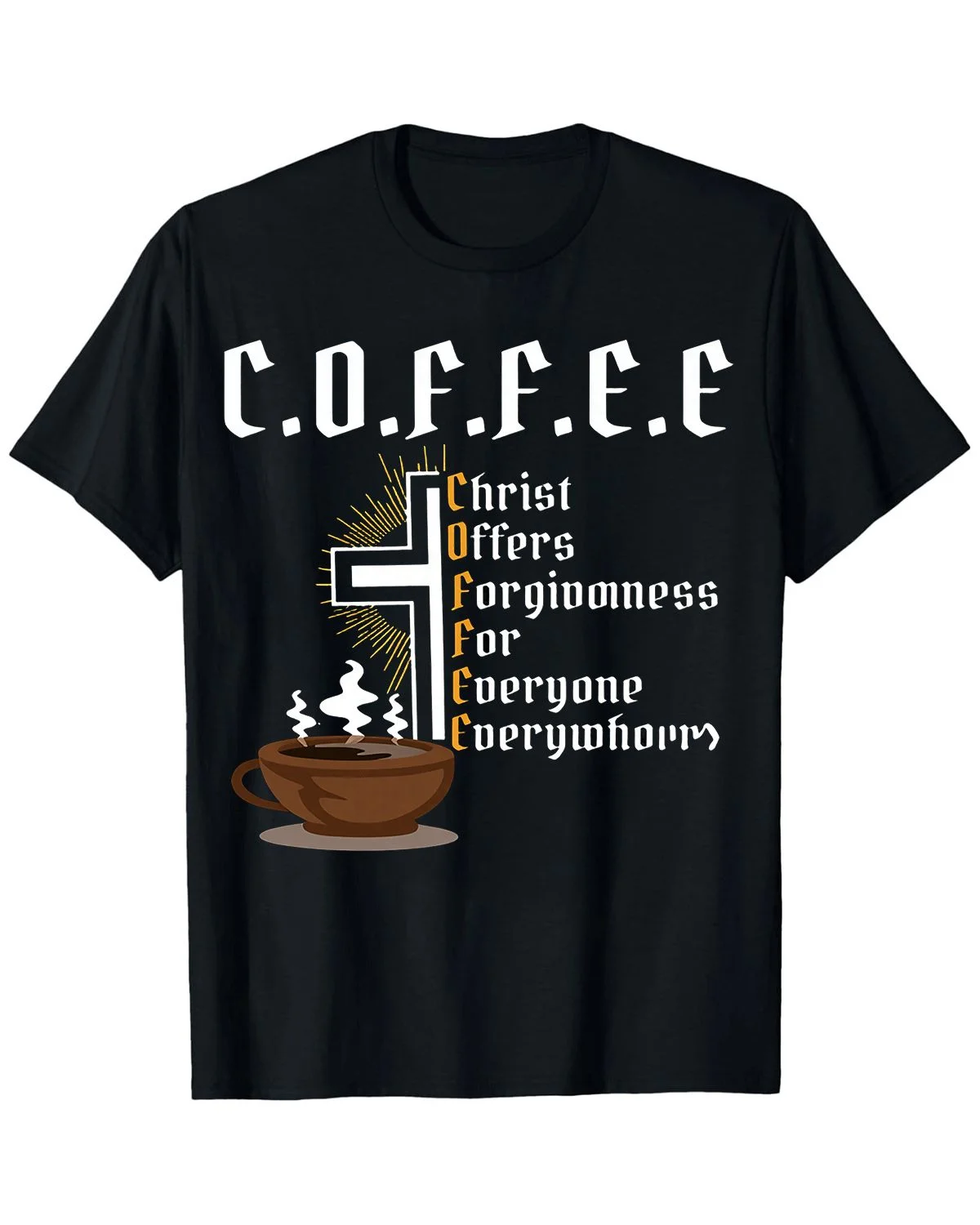 Christ Offers Forgiveness For Everyone Everywhere Coffee Summer Cotton Graphic T Shirt-Casual Vintage,Short Sleeve,Soft Fabric,Comfortable Fit
