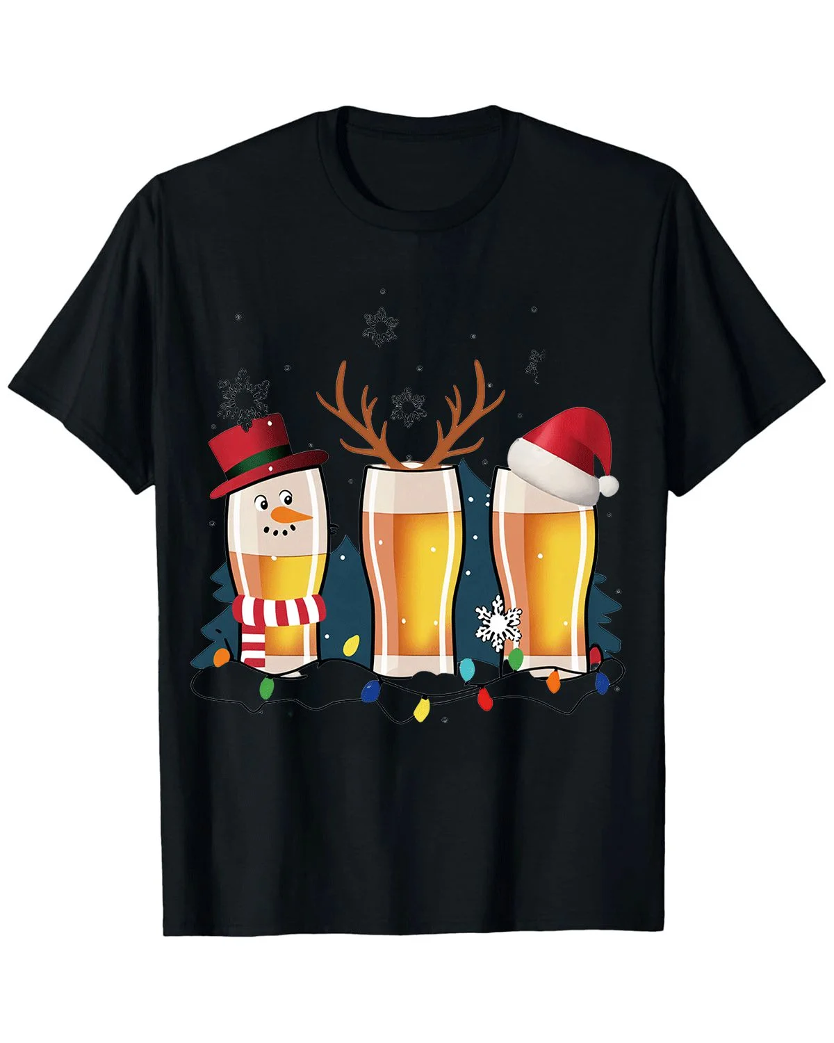 Christmas Beer Glasses with Snowman Reindeer and Santa Hat Summer Cotton Graphic T Shirt - Funny Retro, Short Sleeve, Soft Fabric, Comfortable Fit