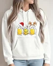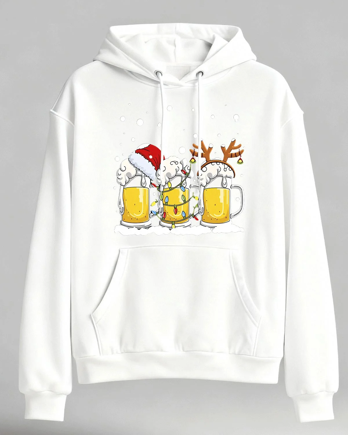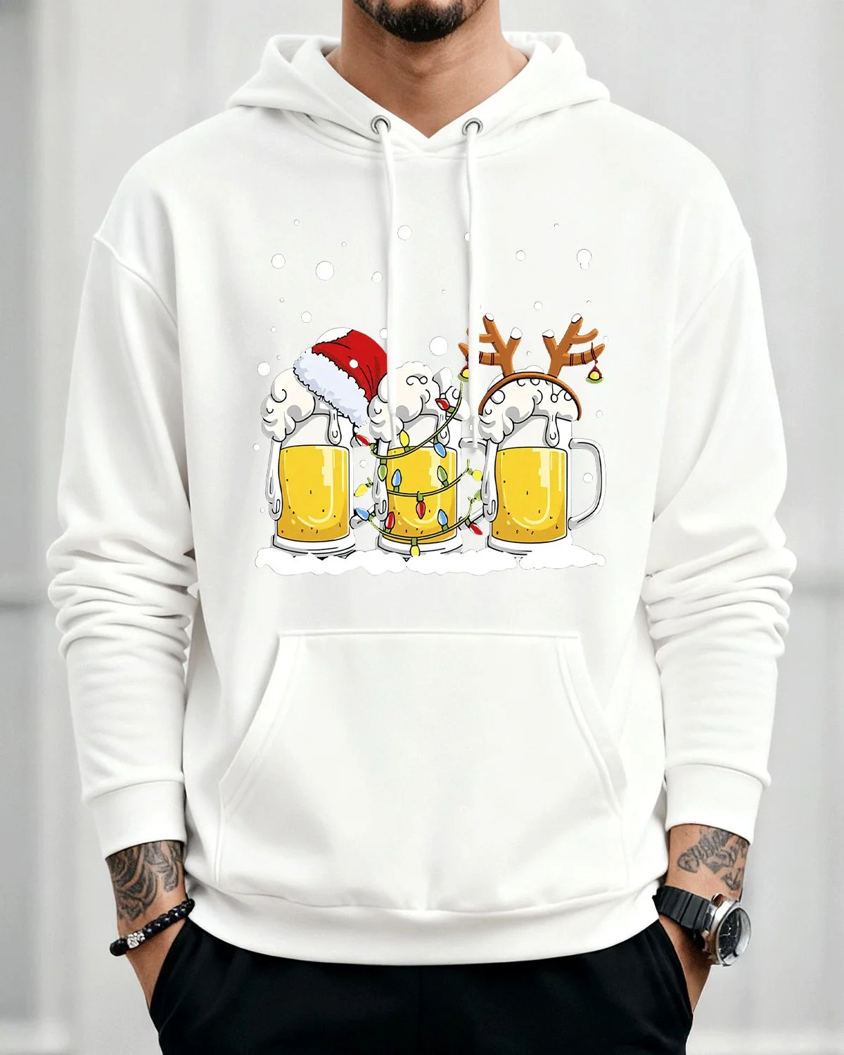 Christmas Beer Mugs with Santa Hat and Reindeer Antlers Cozy Graphic Hoodie for Men and Women - Funny Casual, Long Sleeve, Soft Fabric, Comfortable Fit