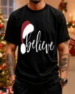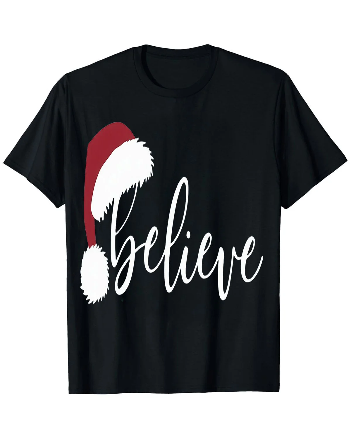 Christmas Believe Santa Hat Summer Cotton Graphic T Shirt - Casual Classic, Short Sleeve, Soft Fabric, Comfortable Fit