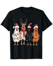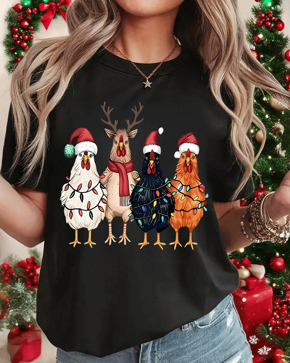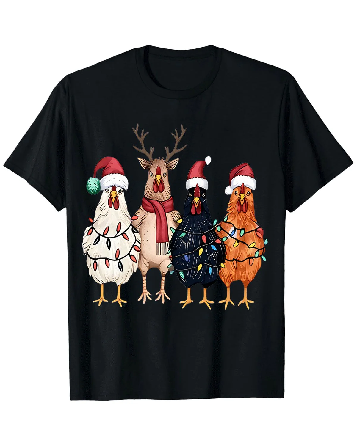 Christmas Chickens and Reindeer in Santa Hats Summer Cotton Graphic T Shirt - Funny Retro, Short Sleeve, Soft Fabric, Comfortable Fit