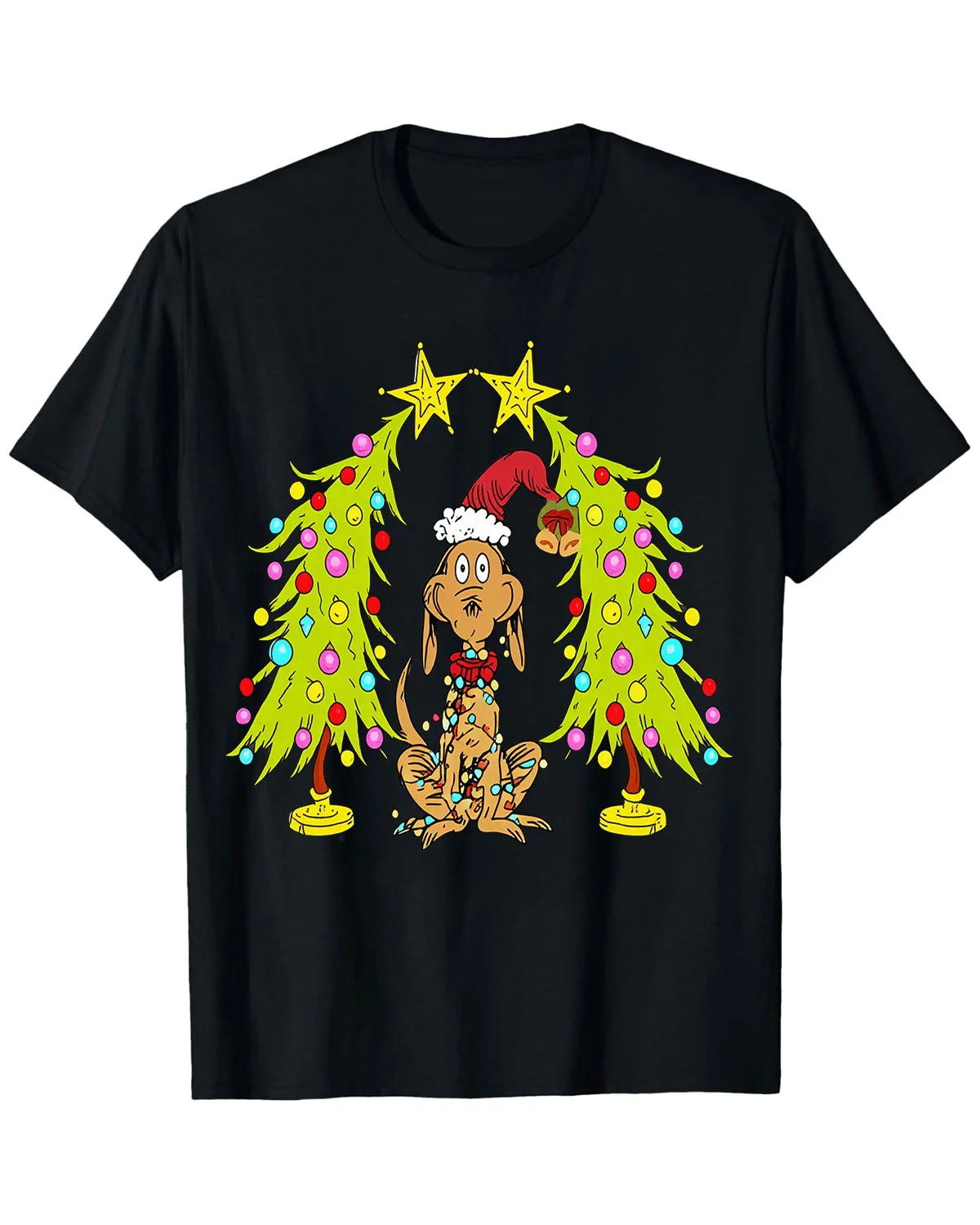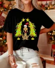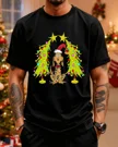 Christmas Dog with Santa Hat and Trees Summer Cotton Graphic T Shirt - Funny Casual, Short Sleeve, Soft Fabric, Comfortable Fit
