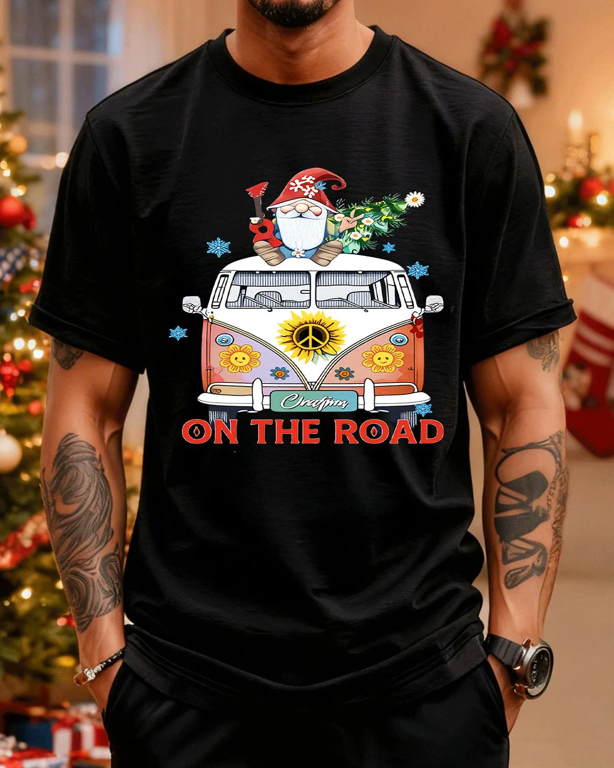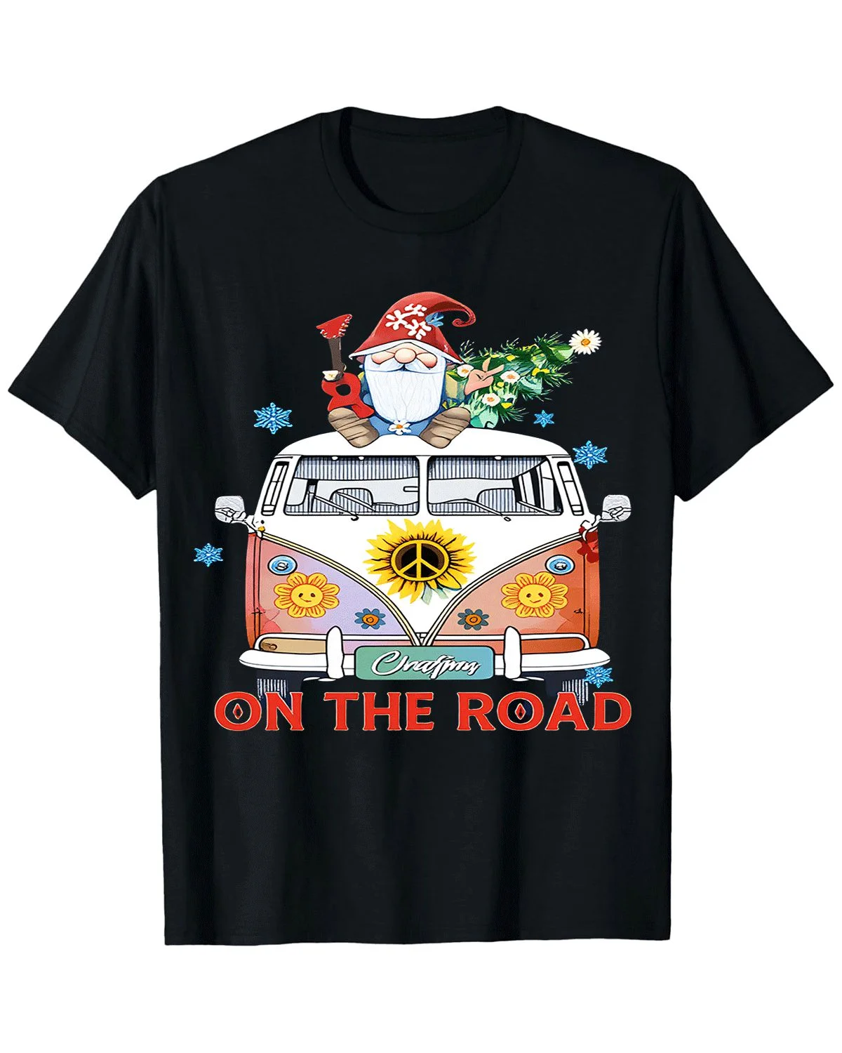 Christmas Gnome Van On The Road Summer Cotton Graphic T Shirt - Casual Retro, Short Sleeve, Soft Fabric, Comfortable Fit