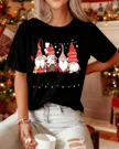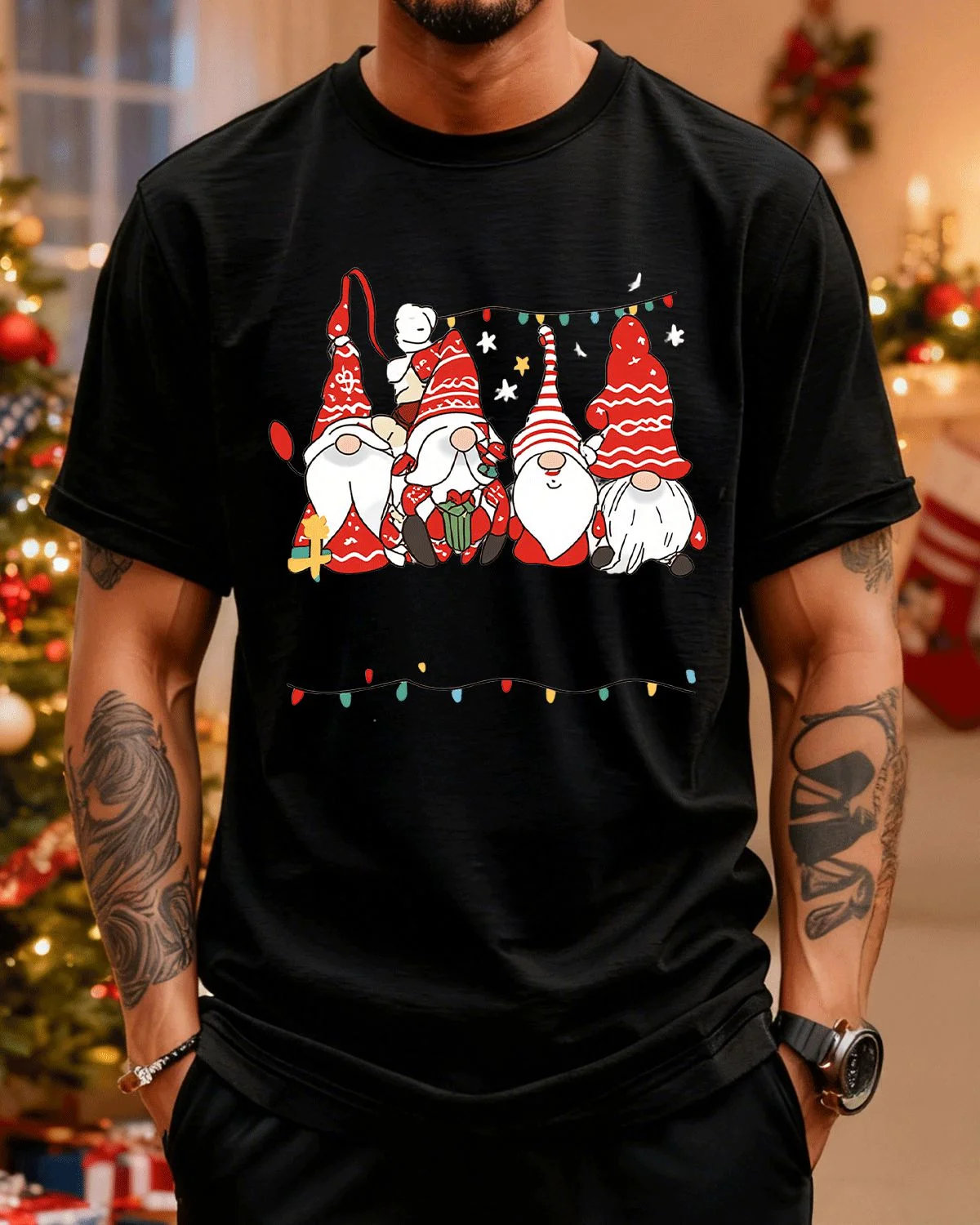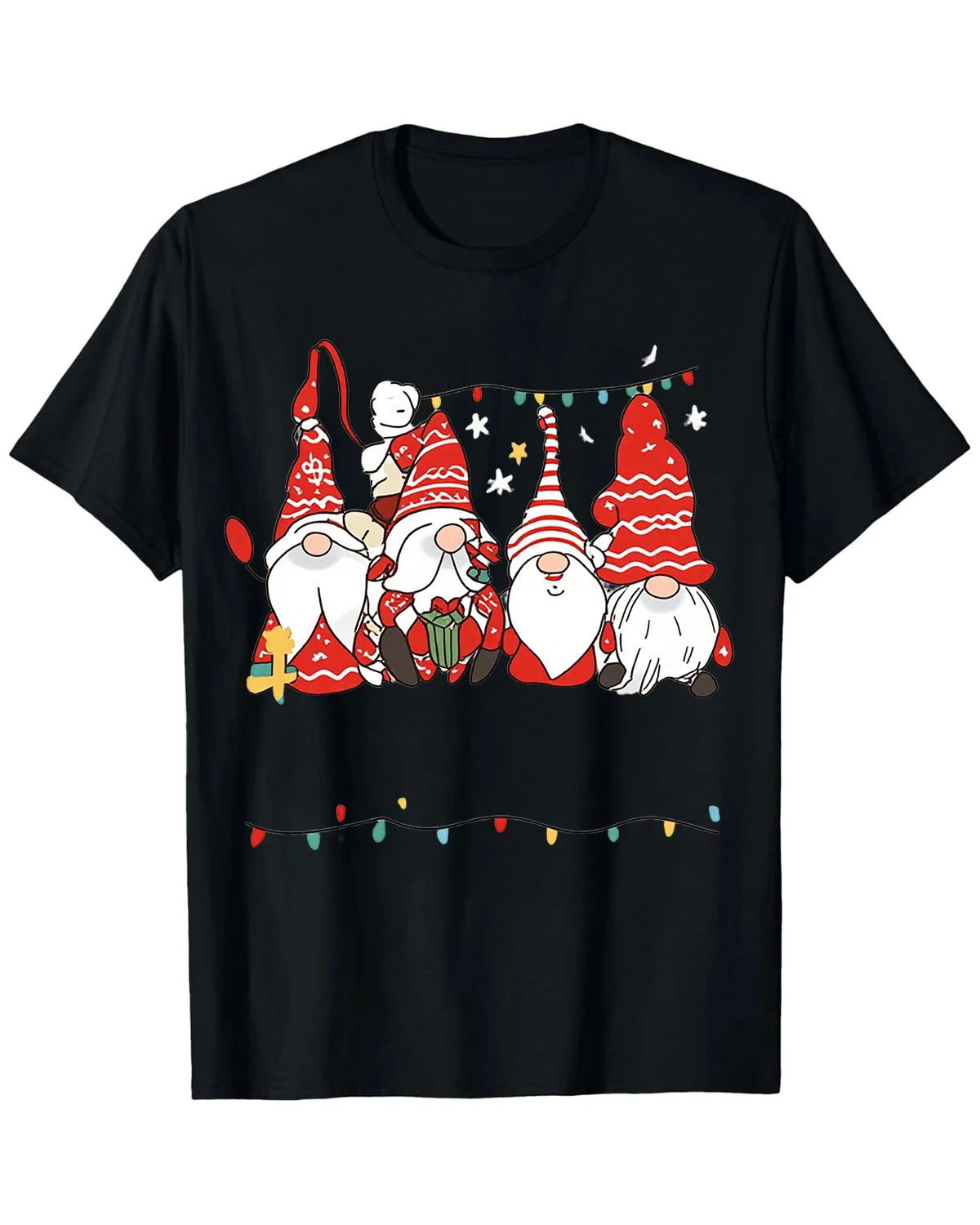 Christmas Gnomes with Gifts and String Lights Summer Cotton Graphic T Shirt - Casual Vintage, Short Sleeve, Soft Fabric, Comfortable Fit