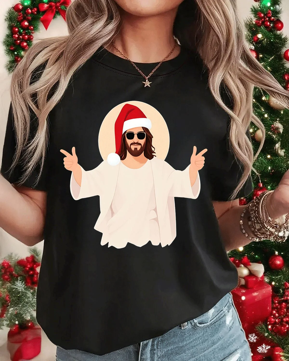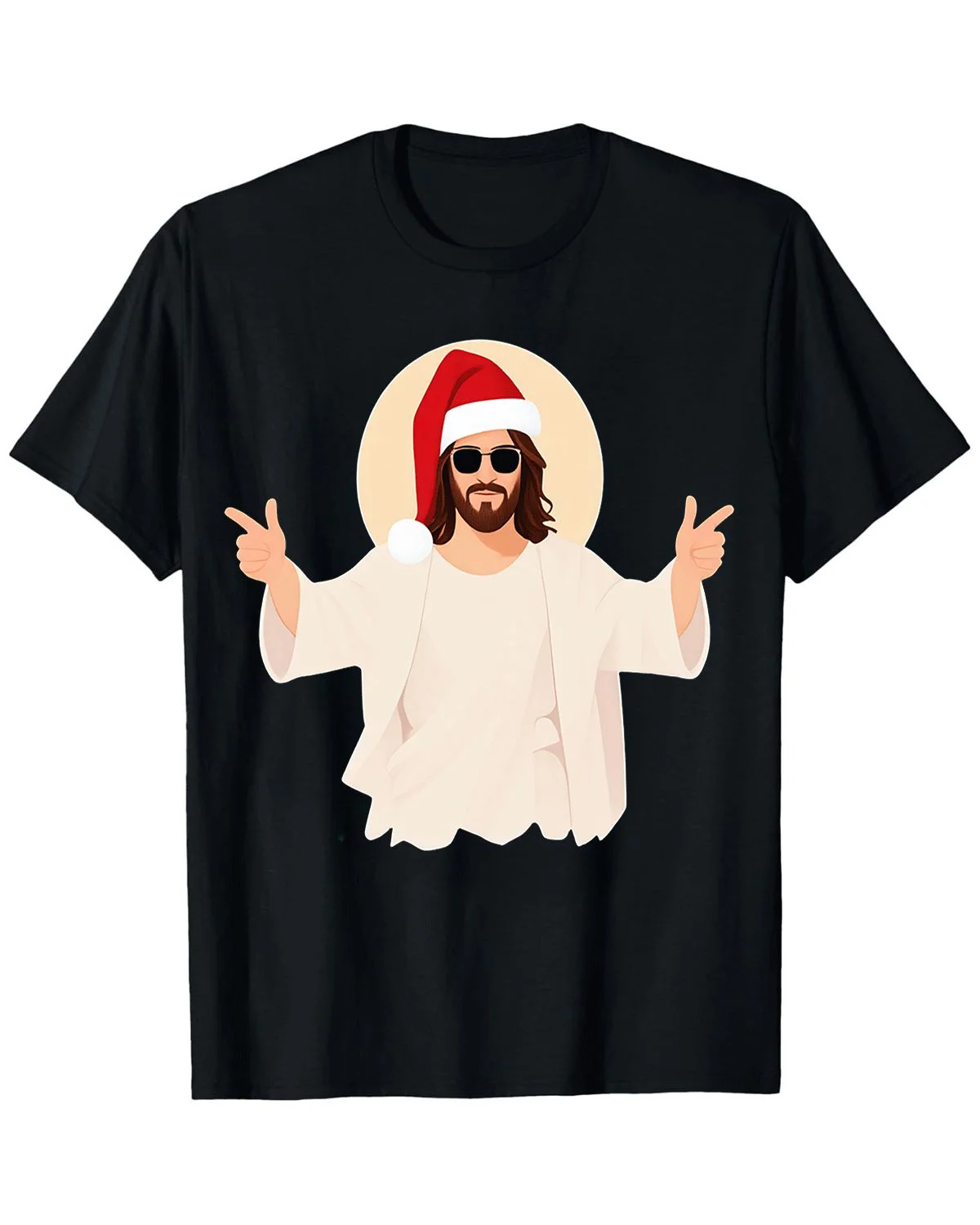 Christmas Jesus with Santa Hat Summer Cotton Graphic T Shirt - Casual Funny, Short Sleeve, Soft Fabric, Comfortable Fit