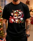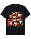 Christmas Reindeer with Gift and Holly Summer Cotton Graphic T Shirt - Casual Vintage, Short Sleeve, Soft Fabric, Comfortable Fit