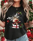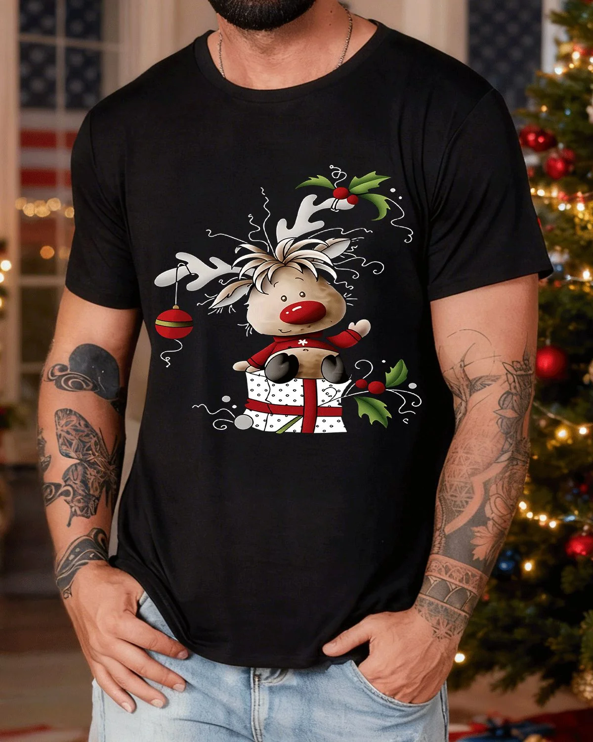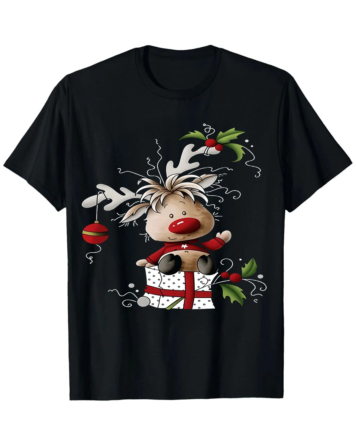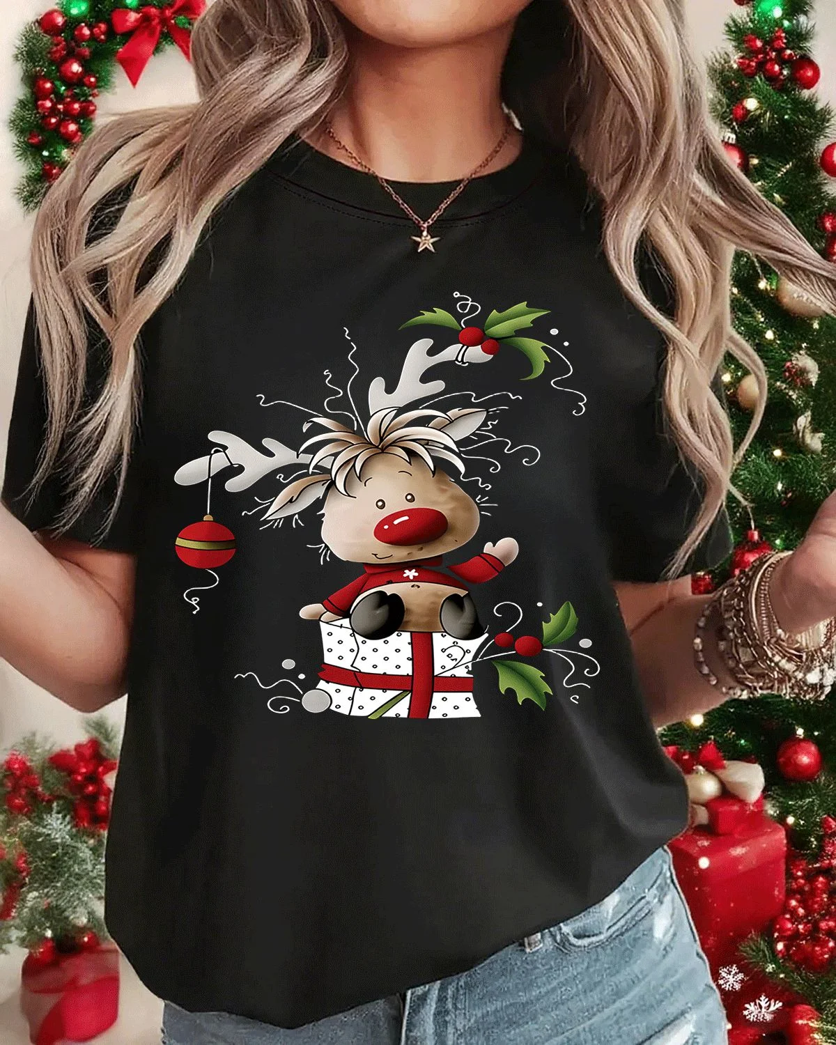 Christmas Reindeer with Gift and Holly Summer Cotton Graphic T Shirt - Casual Vintage, Short Sleeve, Soft Fabric, Comfortable Fit