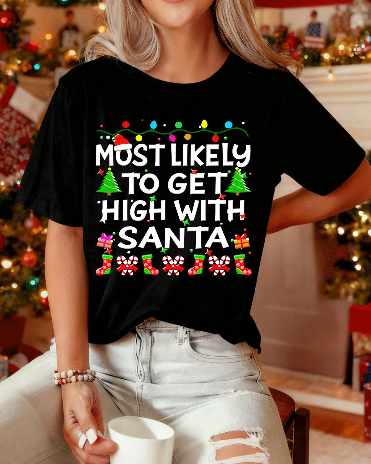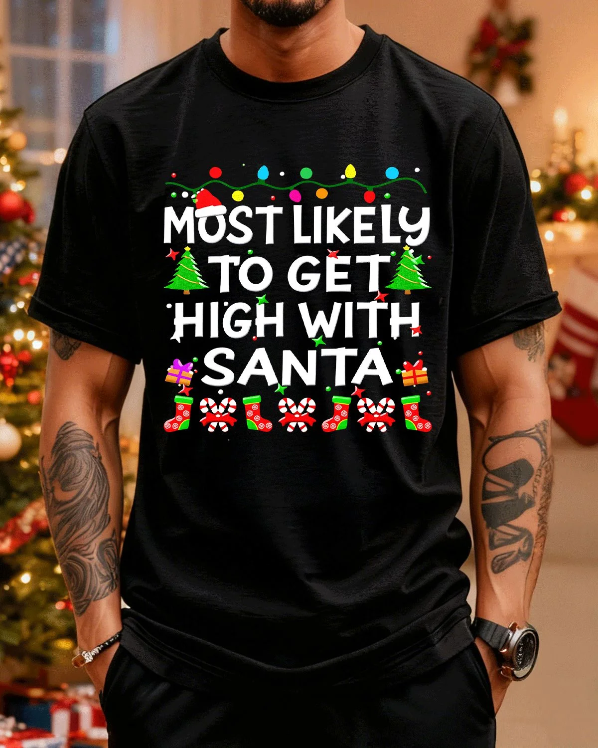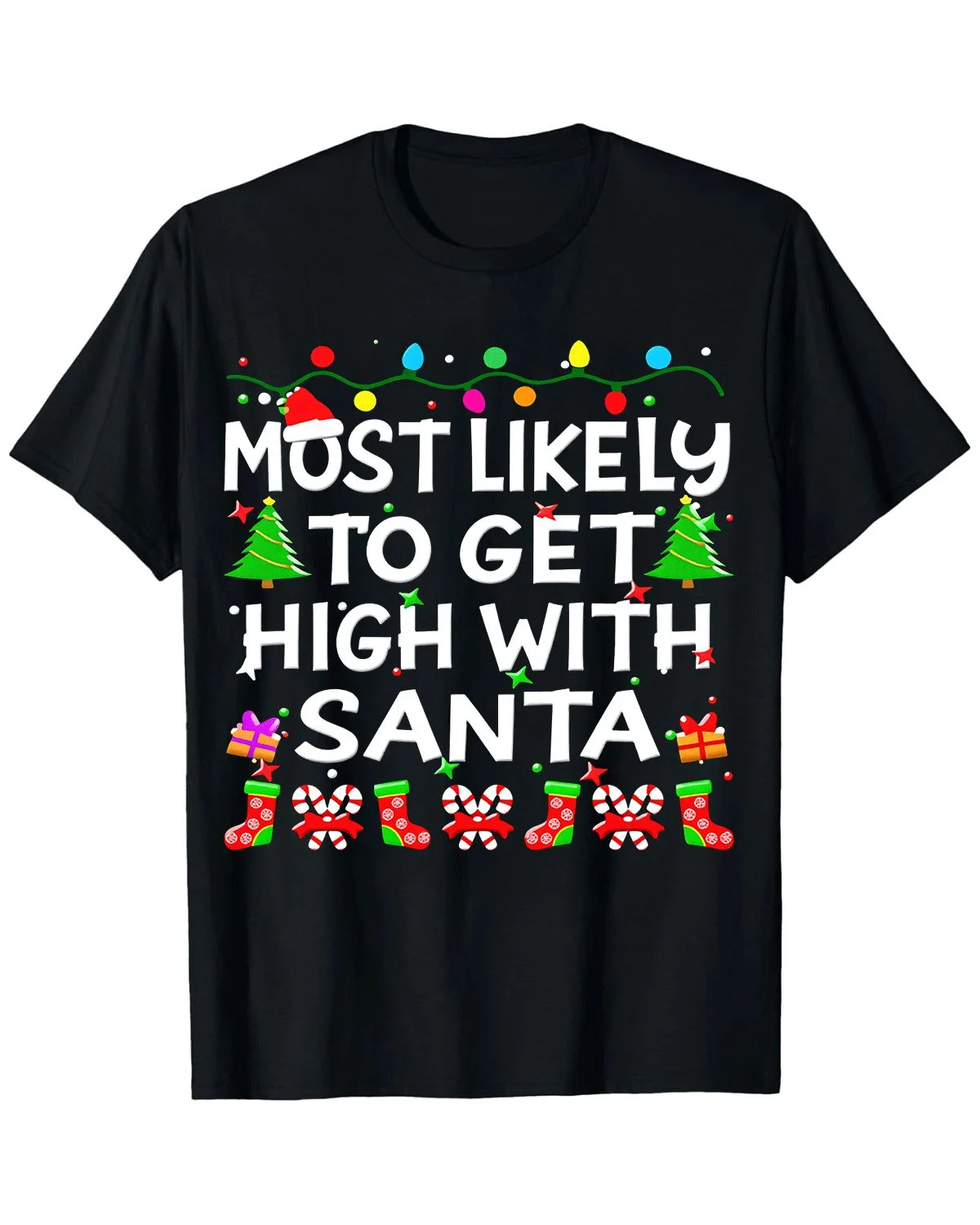 Christmas Santa and Trees Party Theme Summer Cotton Graphic T Shirt - Casual Funny, Short Sleeve, Soft Fabric, Comfortable Fit