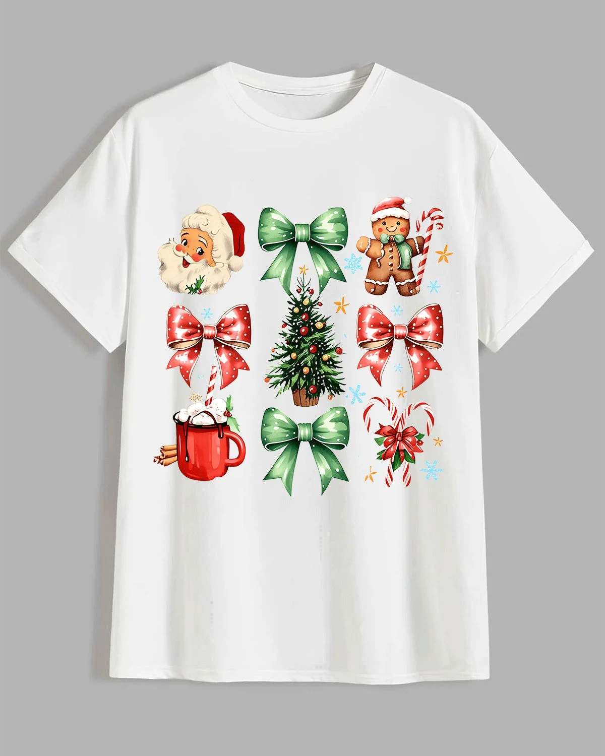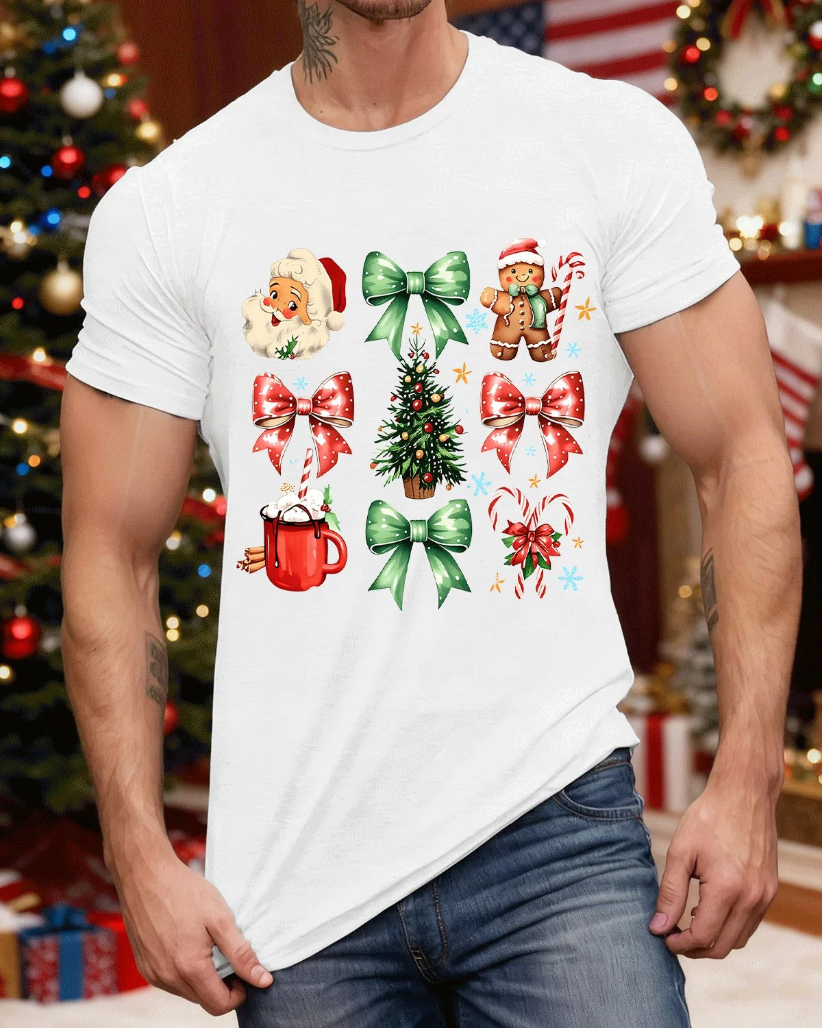 Christmas Santa Gingerbread Tree and Candy Canes Summer Cotton Graphic T Shirt - Casual Vintage, Short Sleeve, Soft Fabric, Comfortable Fit