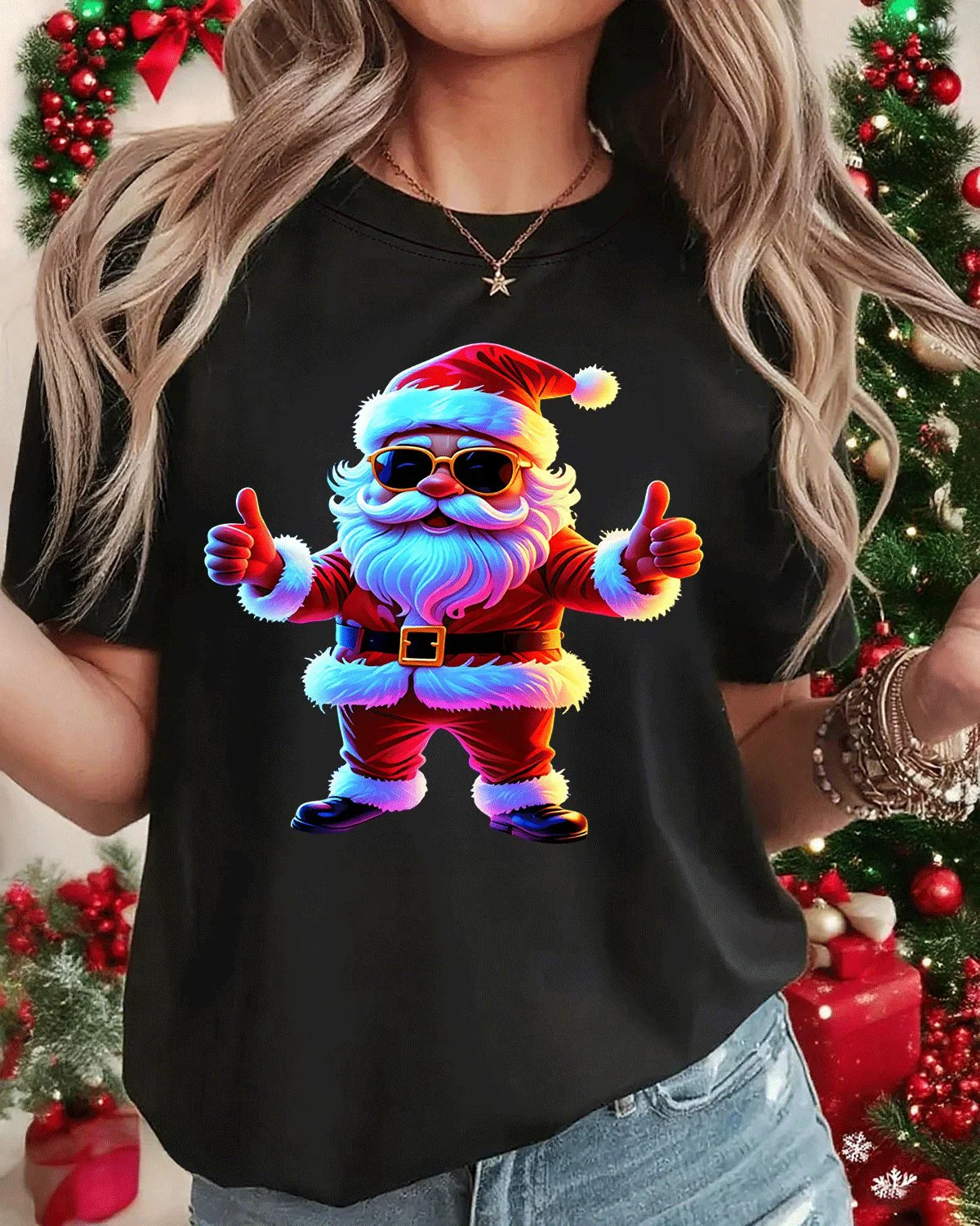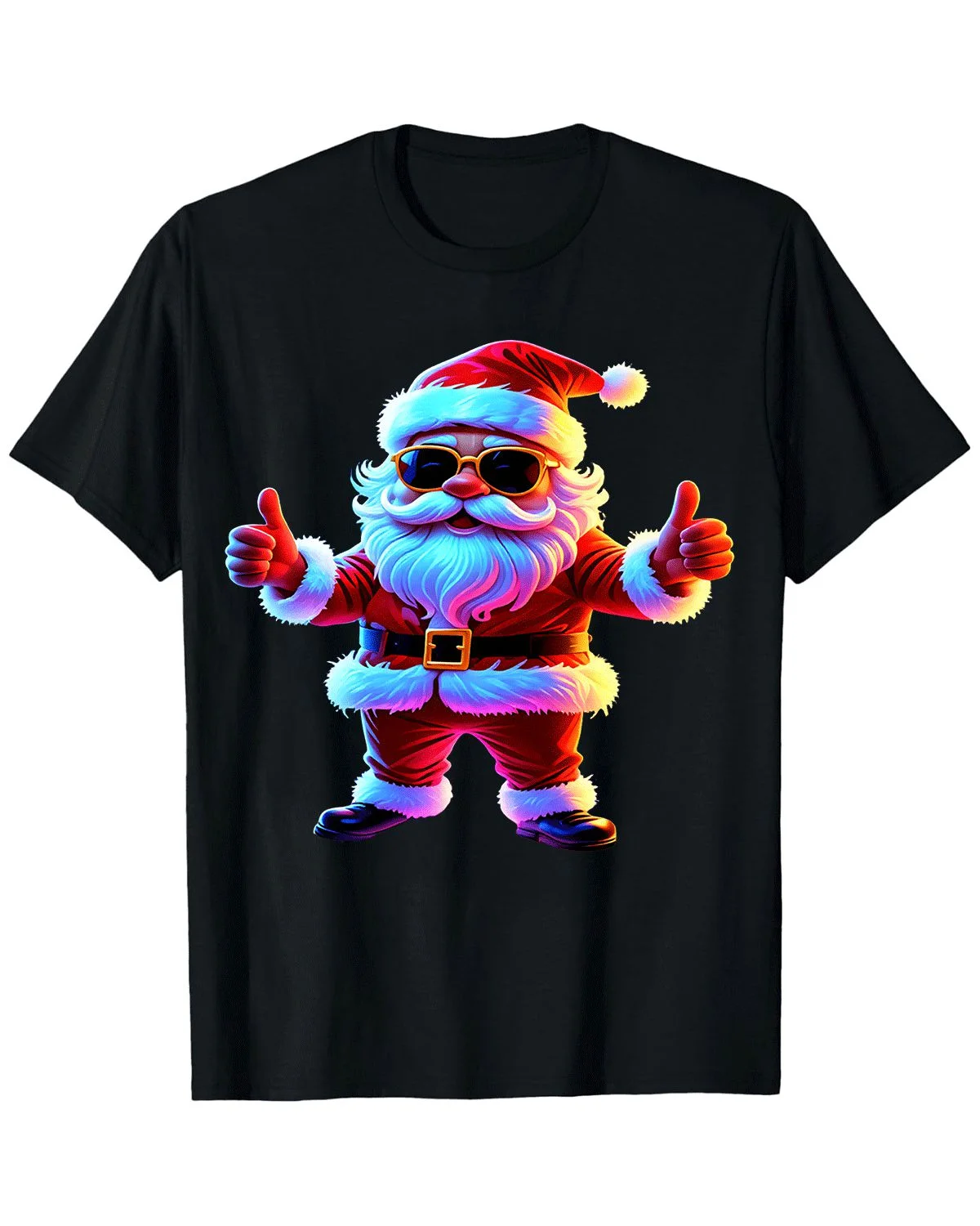 Christmas Santa Giving Thumbs Up Summer Cotton Graphic T Shirt - Casual Vintage, Short Sleeve, Soft Fabric, Comfortable Fit