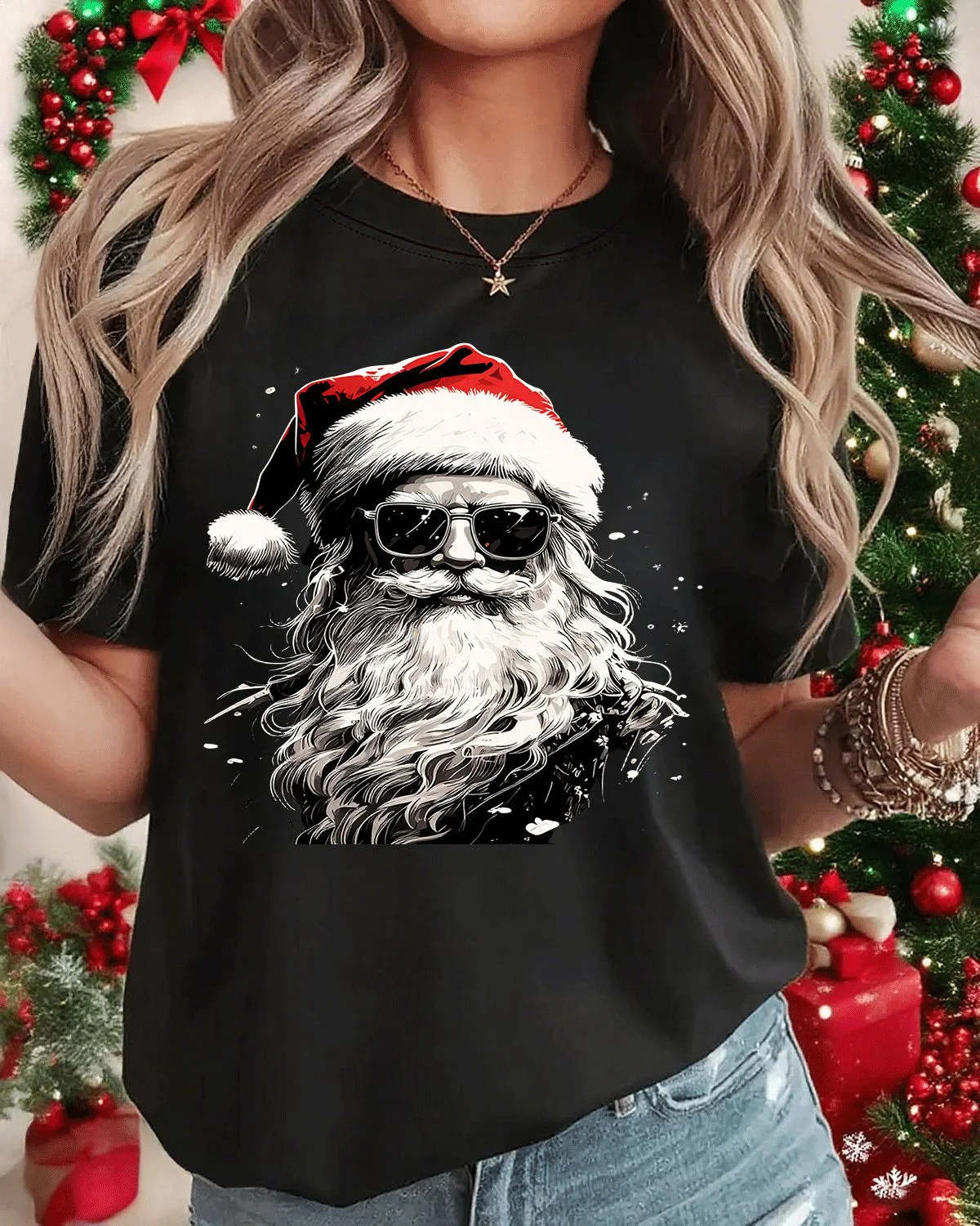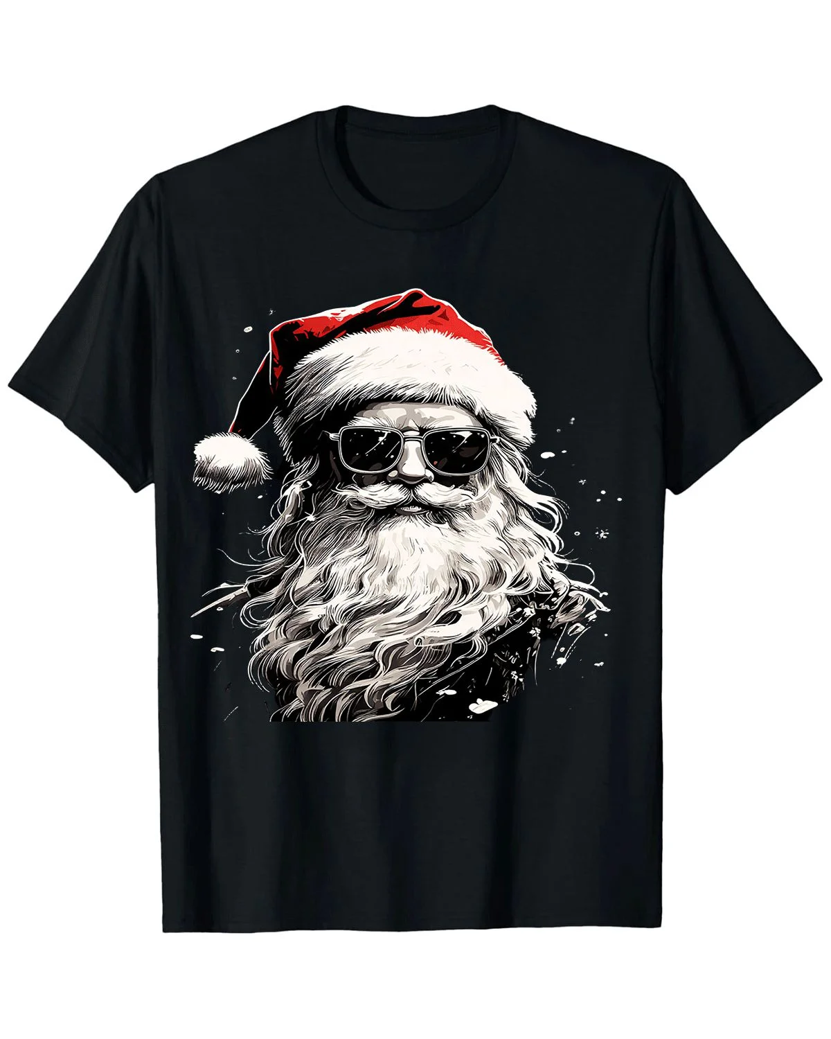 Christmas Santa Hat and Beard Summer Cotton Graphic T Shirt - Casual Vintage, Short Sleeve, Soft Fabric, Comfortable Fit