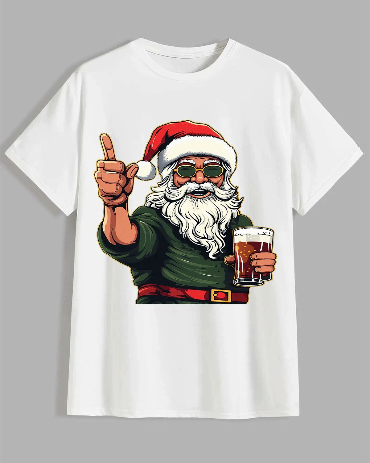 Christmas Santa Holding Beer Summer Cotton Graphic T Shirt - Casual Funny, Short Sleeve, Soft Fabric, Comfortable Fit