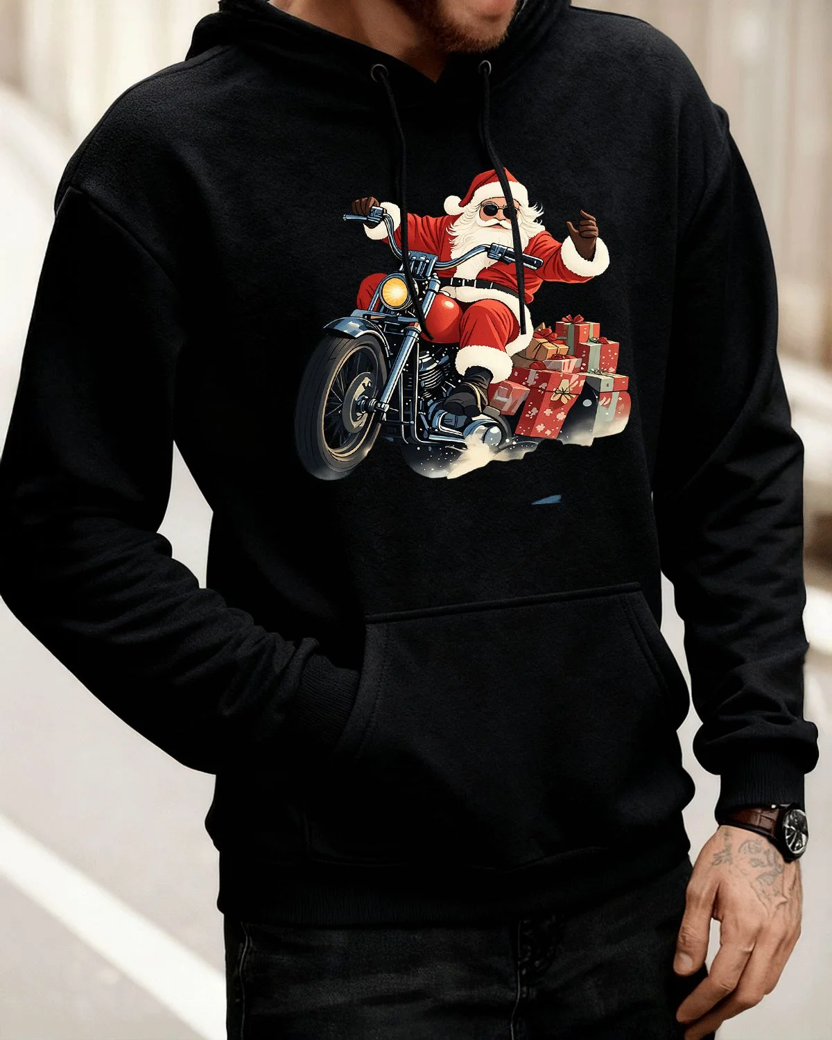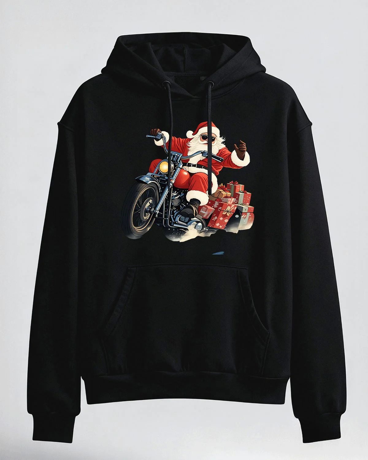 Christmas Santa Riding Motorcycle with Gifts Cozy Graphic Hoodie for Men and Women - Cool Retro, Long Sleeve, Soft Fabric, Comfortable Fit