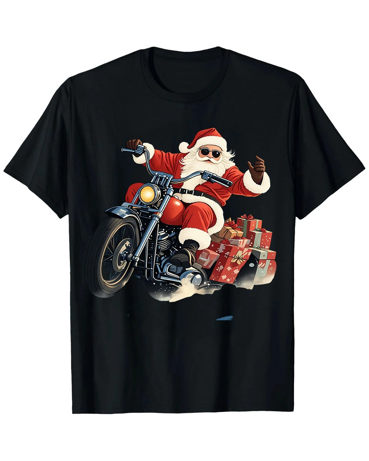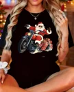 Christmas Santa Riding Motorcycle with Gifts Summer Cotton Graphic T Shirt - Cool Retro, Short Sleeve, Soft Fabric, Comfortable Fit