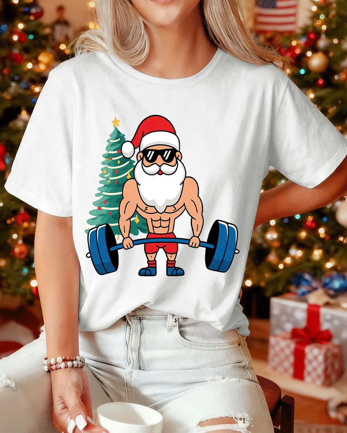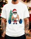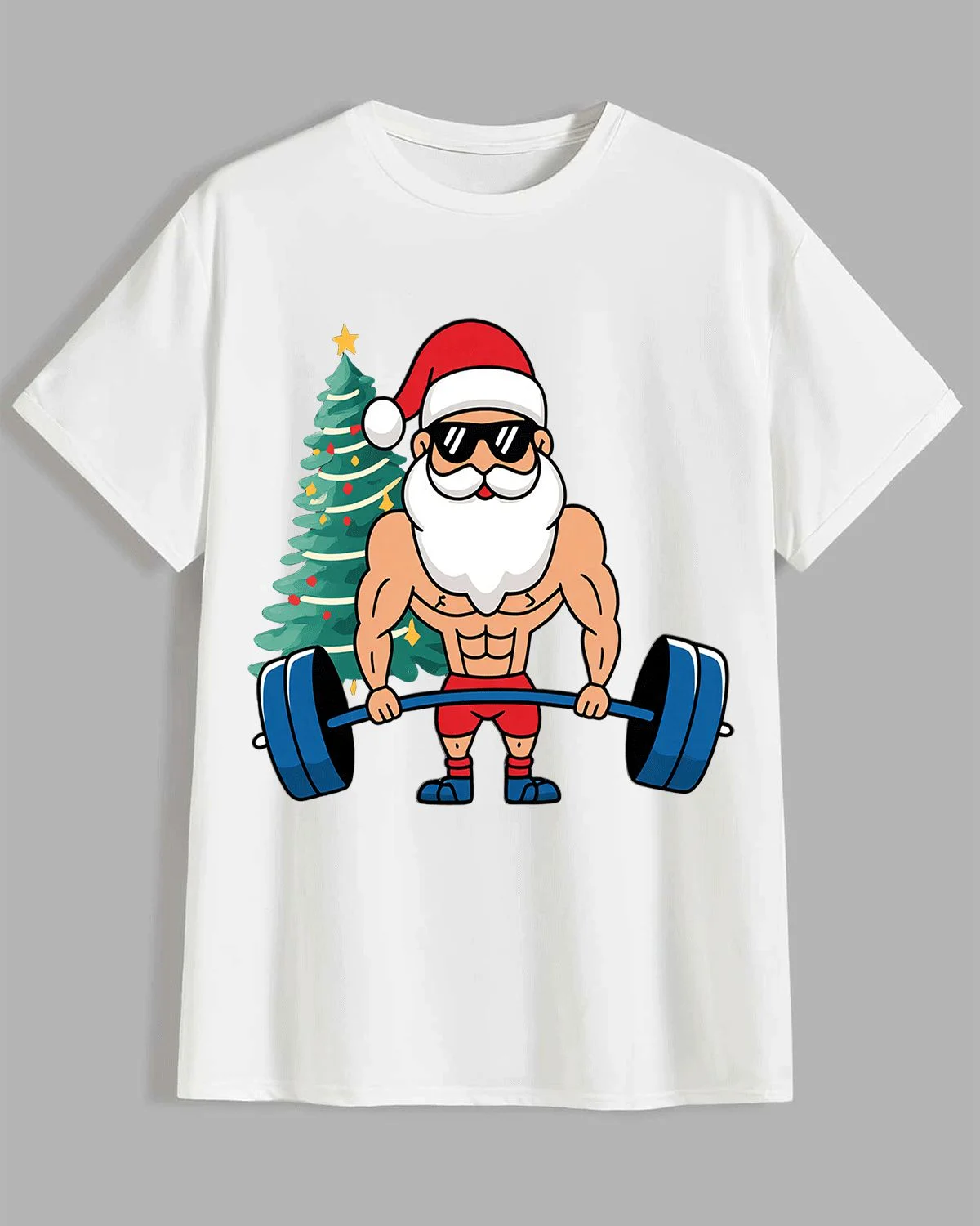 Christmas Santa Weightlifting with Tree Summer Cotton Graphic T Shirt - Casual Funny, Short Sleeve, Soft Fabric, Comfortable Fit