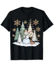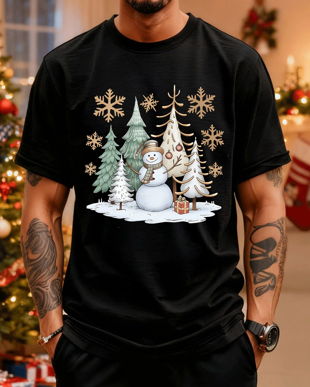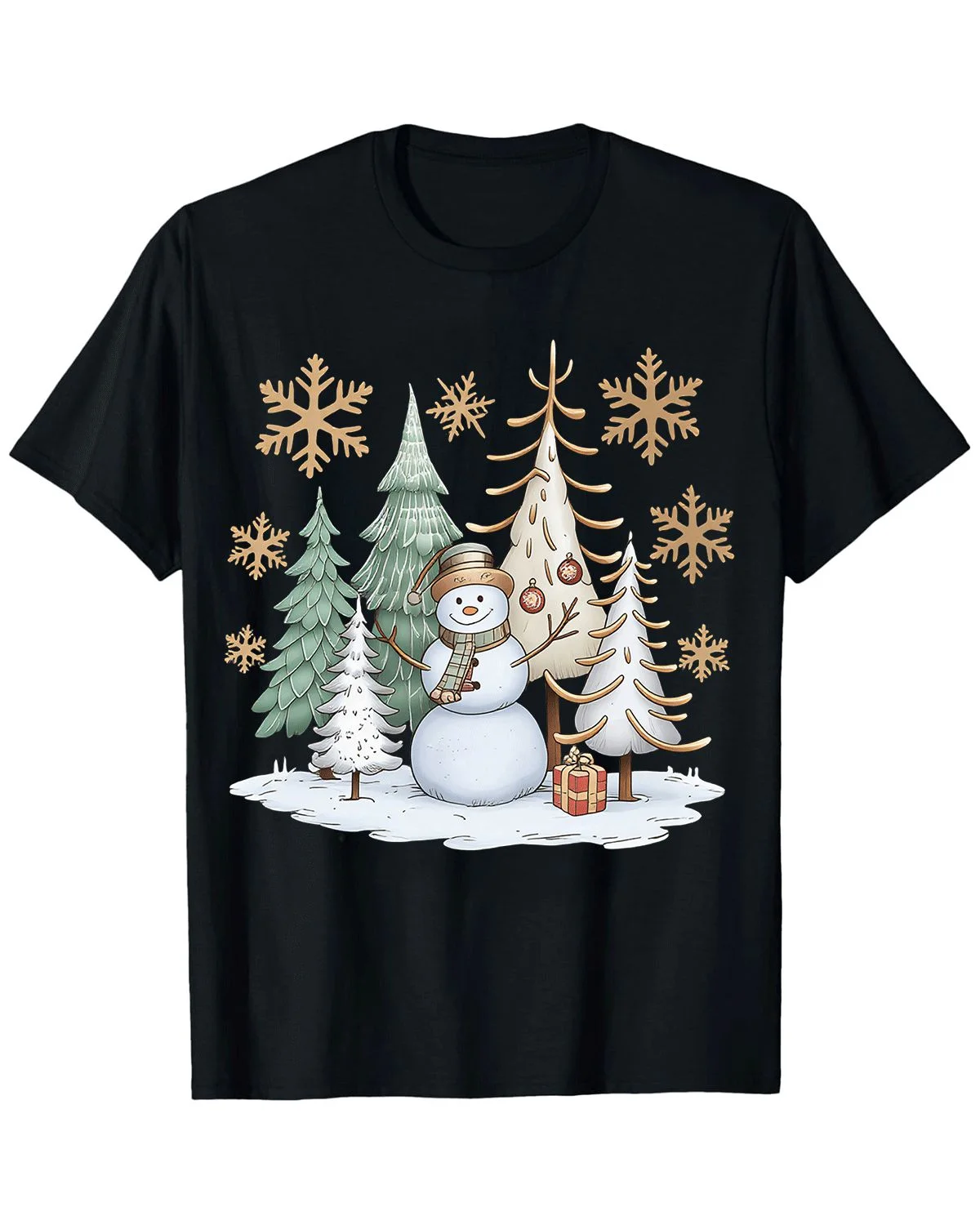 Christmas Snowman and Festive Trees Summer Cotton Graphic T Shirt - Casual Vintage, Short Sleeve, Soft Fabric, Comfortable Fit