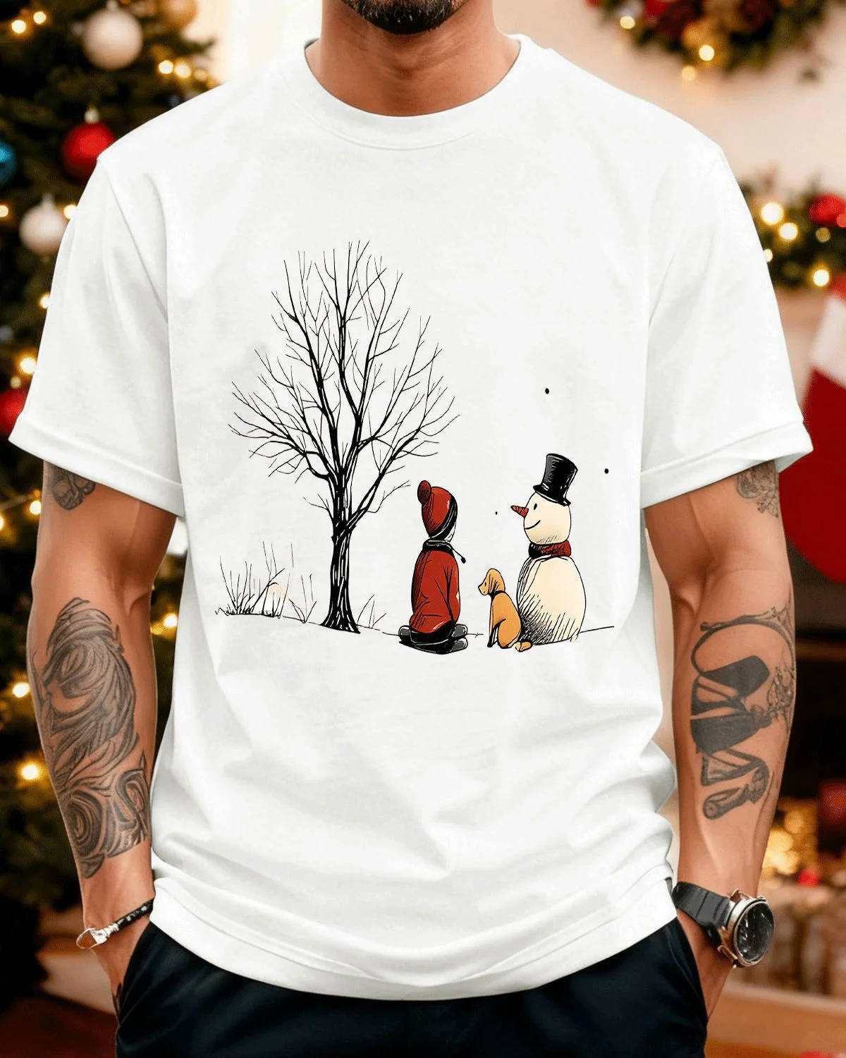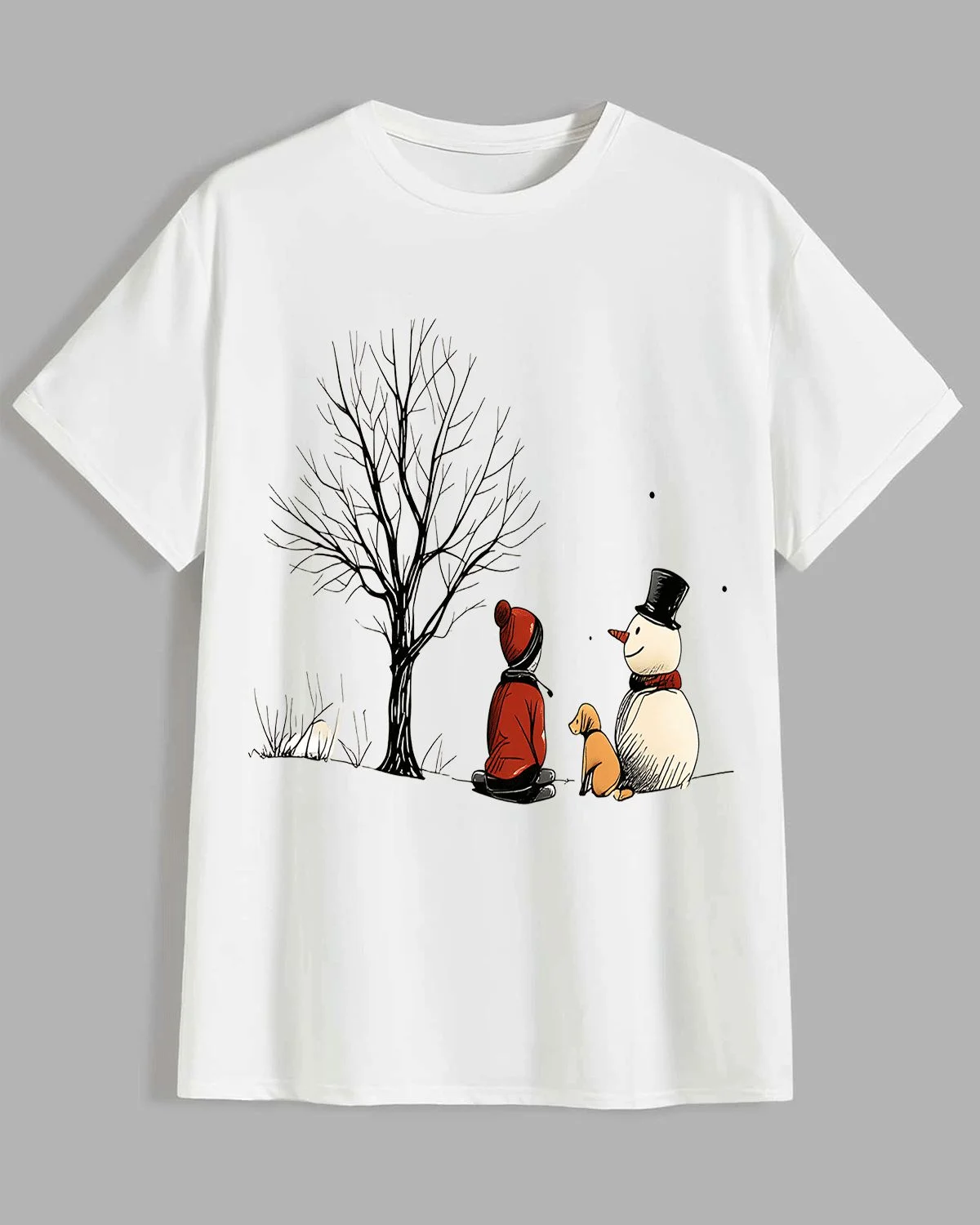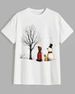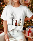Christmas Snowman and Winter Tree Scene Summer Cotton Graphic T Shirt - Casual Vintage, Short Sleeve, Soft Fabric, Comfortable Fit