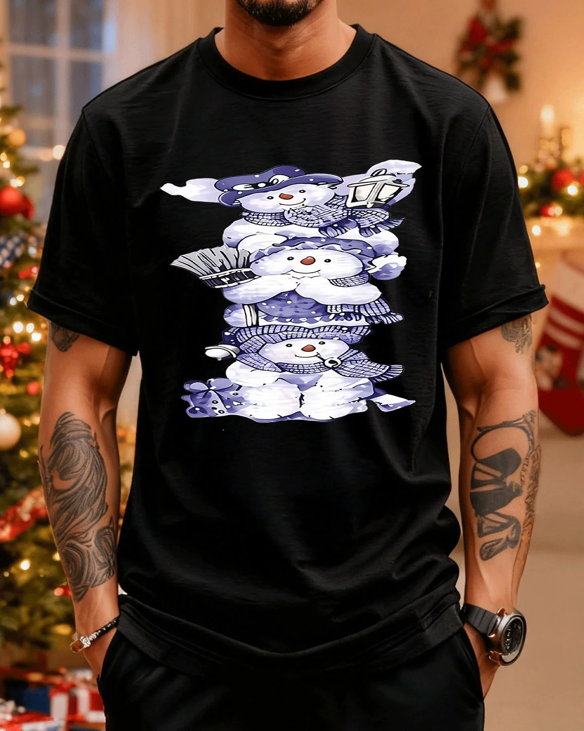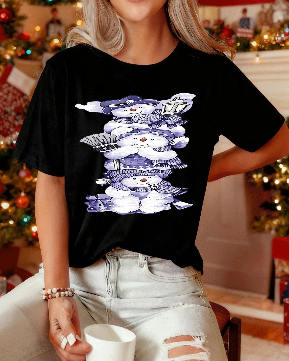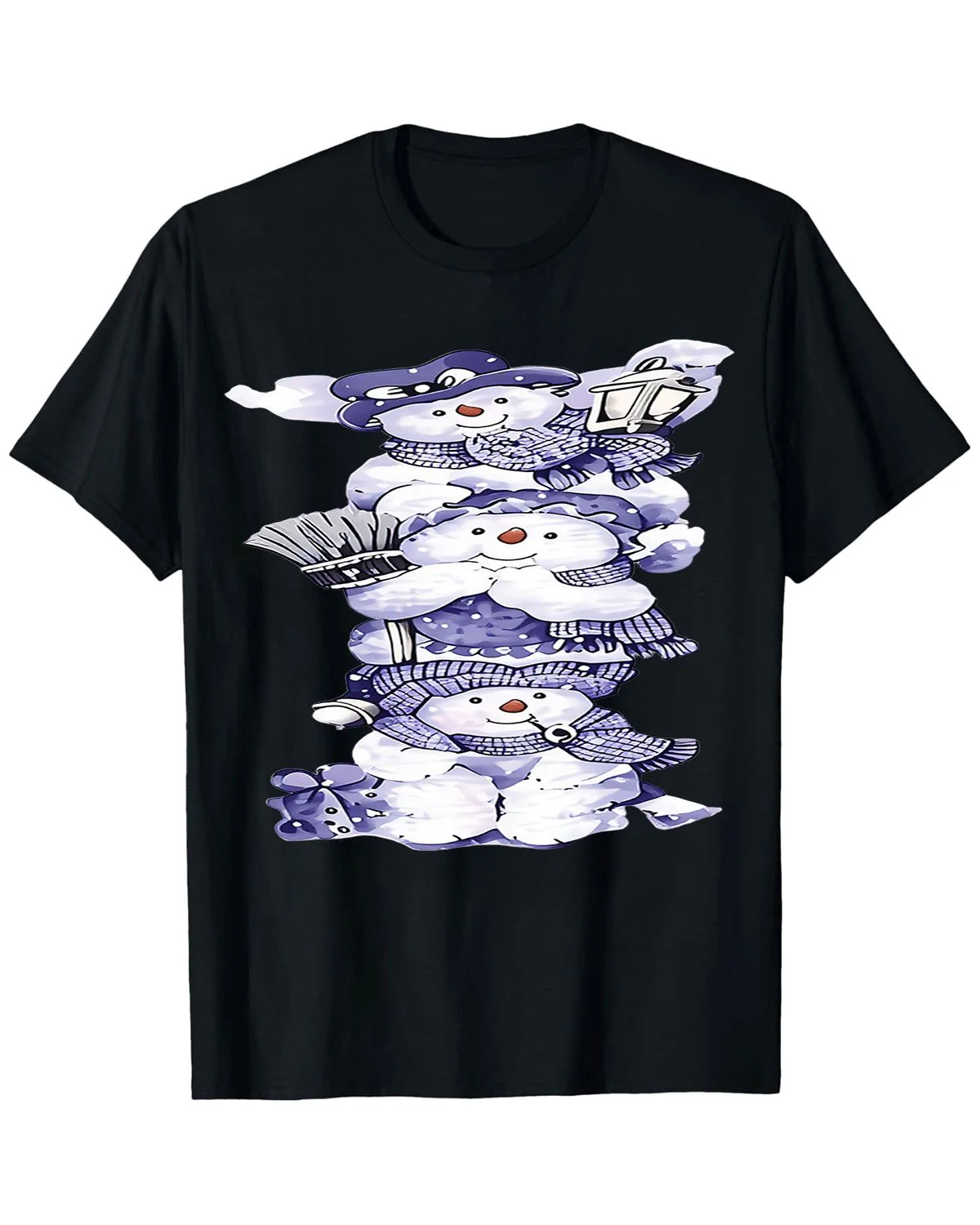 Christmas Snowman Family Stack Summer Cotton Graphic T Shirt - Casual Vintage, Short Sleeve, Soft Fabric, Comfortable Fit
