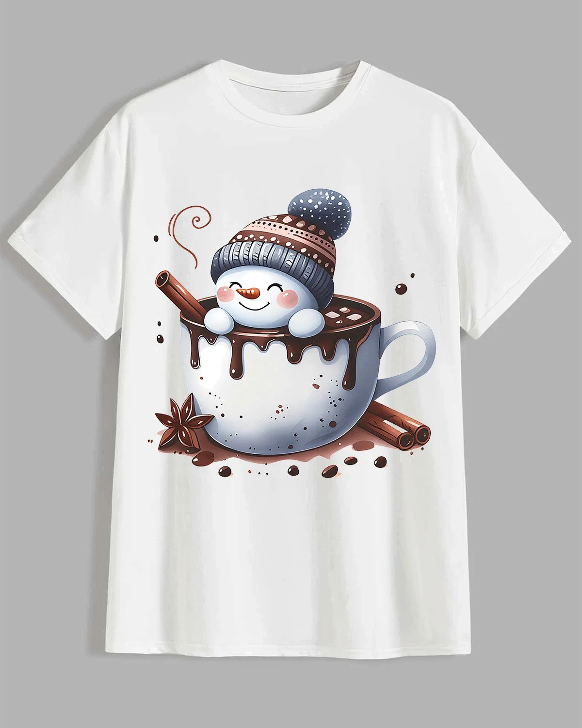 Christmas Snowman in Hot Chocolate Cup Summer Cotton Graphic T Shirt - Casual Cute, Short Sleeve, Soft Fabric, Comfortable Fit