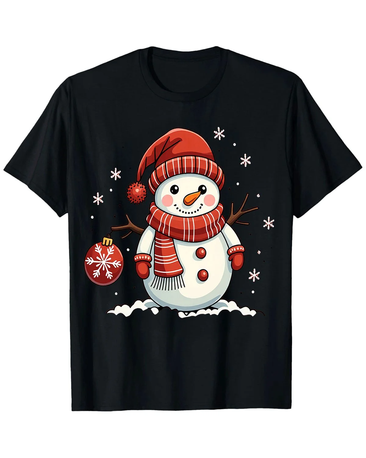 Christmas Snowman with Red Scarf and Ornament Summer Cotton Graphic T Shirt - Casual Vintage, Short Sleeve, Soft Fabric, Comfortable Fit