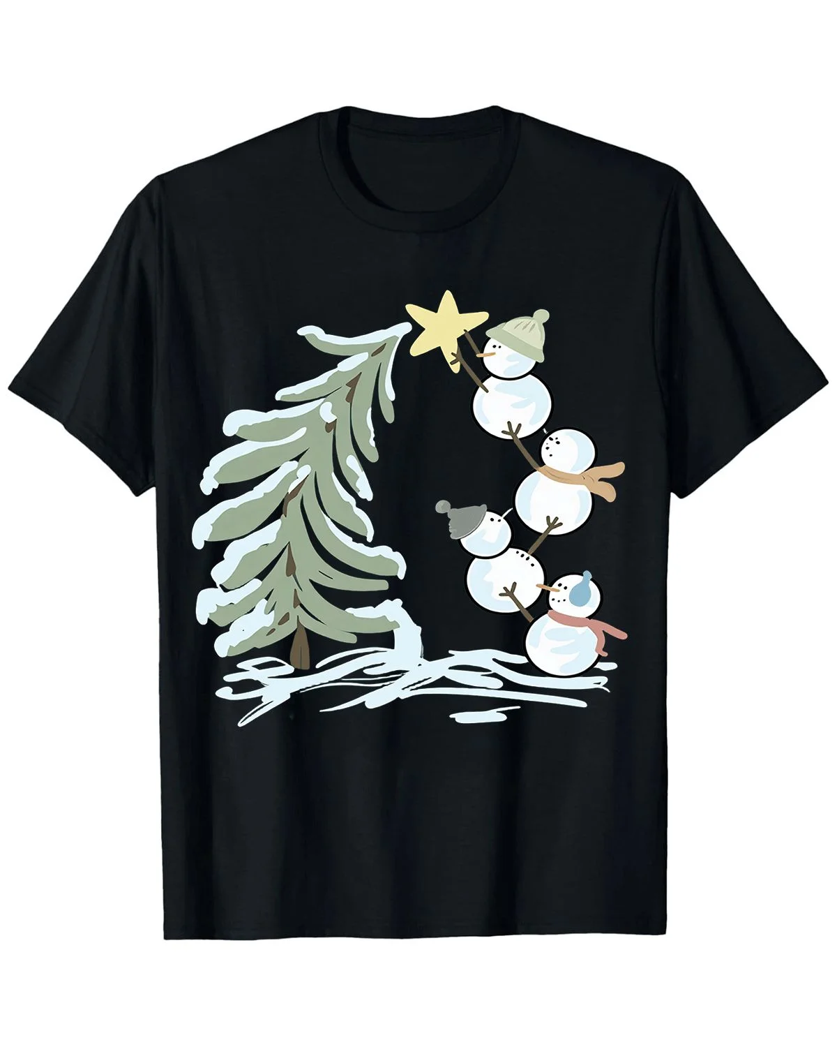Christmas Snowmen Decorating Tree Summer Cotton Graphic T Shirt - Casual Vintage, Short Sleeve, Soft Fabric, Comfortable Fit