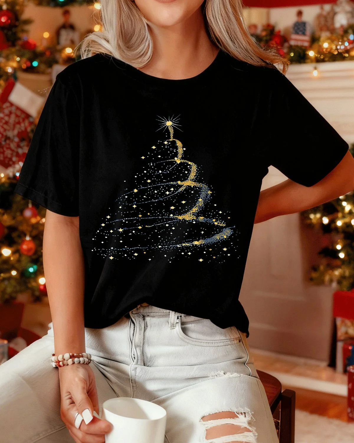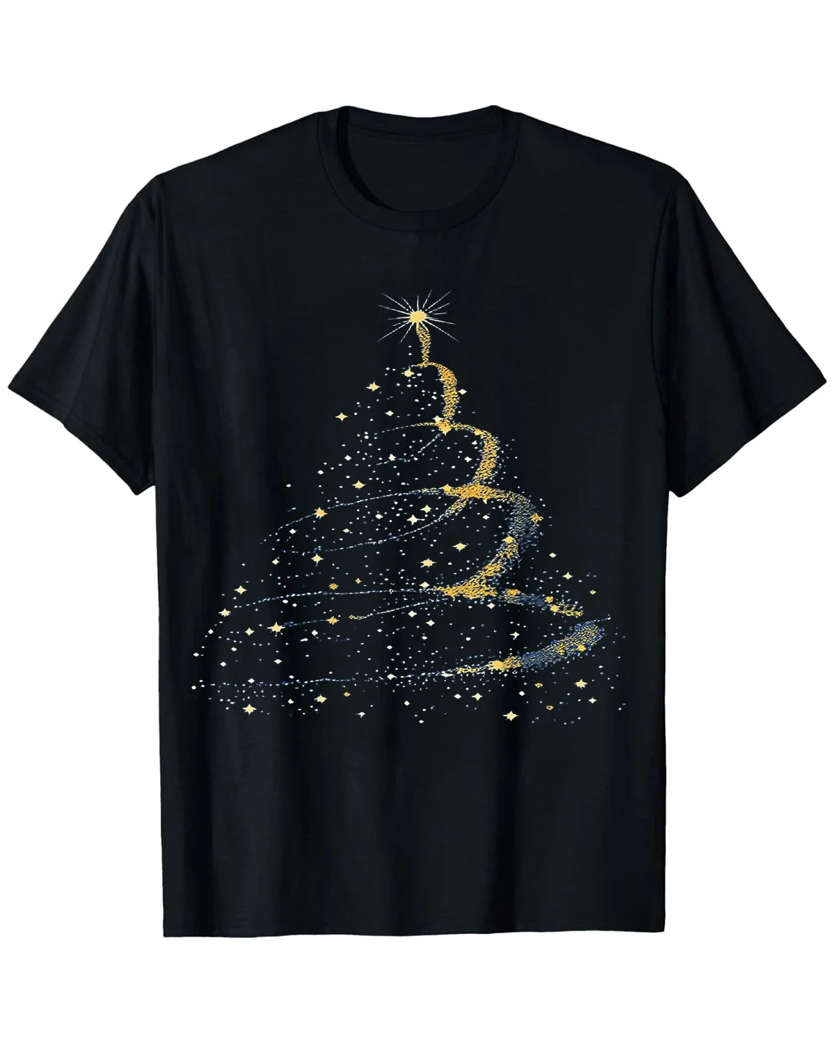 Christmas Sparkling Star Tree Summer Cotton Graphic T Shirt - Artistic Modern, Short Sleeve, Soft Fabric, Comfortable Fit