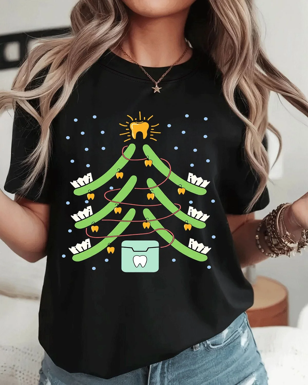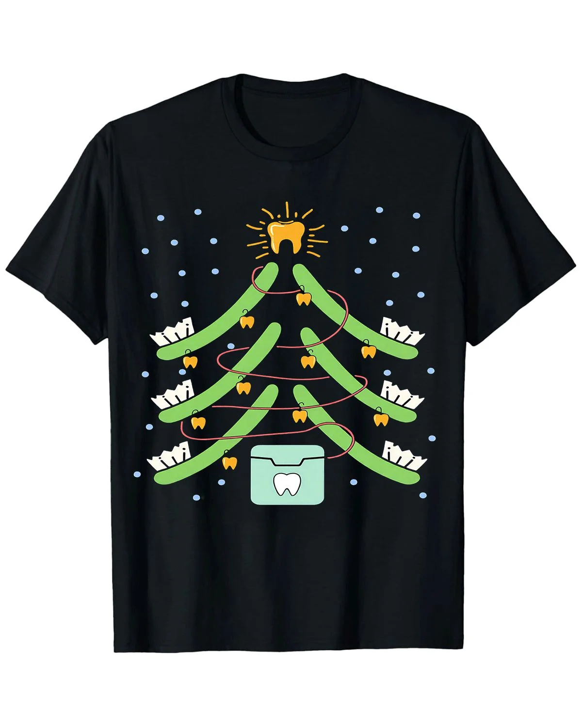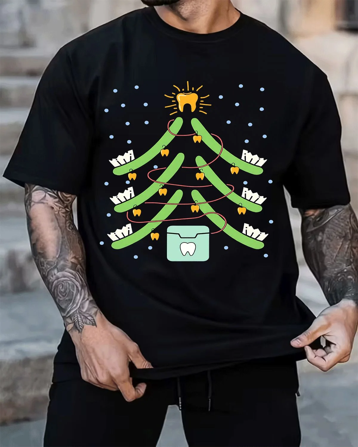 Christmas Tree with Teeth and Floss Summer Cotton Graphic T Shirt-Funny Artistic,Short Sleeve,Soft Fabric,Comfortable Fit