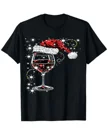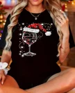 Christmas Wine Glass with Santa Hat Summer Cotton Graphic T Shirt - Casual Chic, Short Sleeve, Soft Fabric, Comfortable Fit