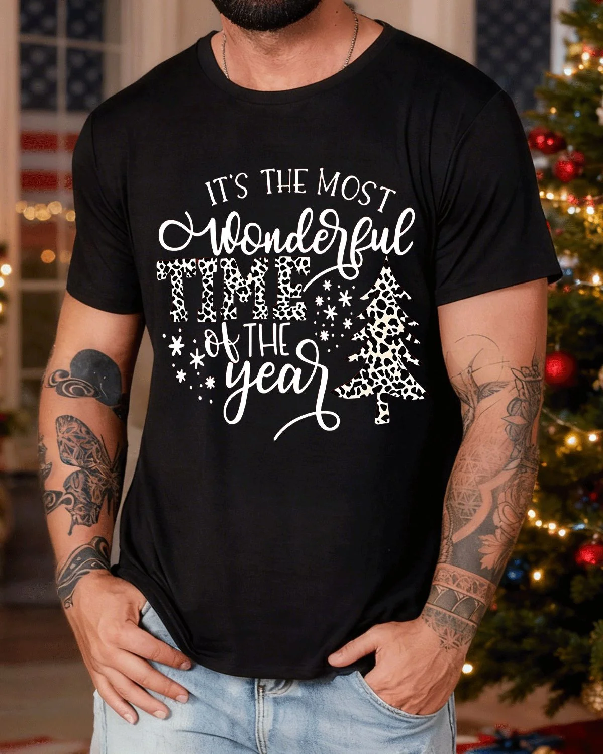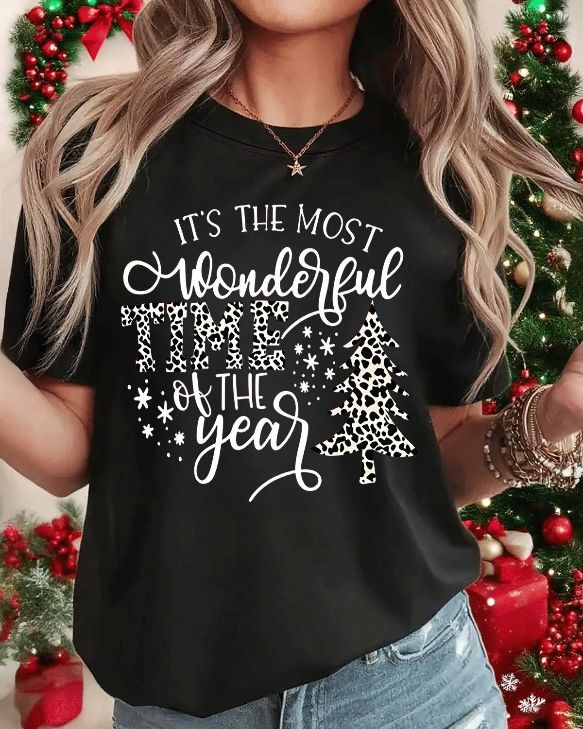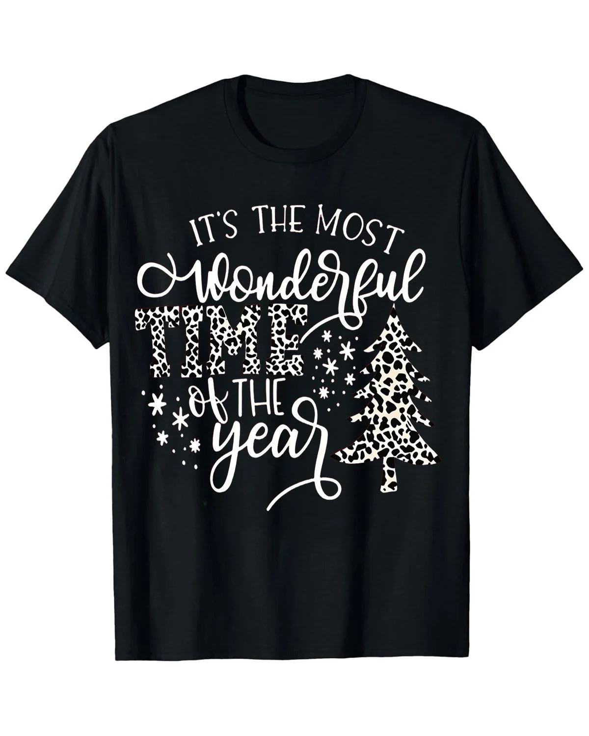 Christmas Wonderful Time Leopard Tree Summer Cotton Graphic T Shirt - Casual Vintage, Short Sleeve, Soft Fabric, Comfortable Fit