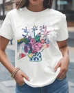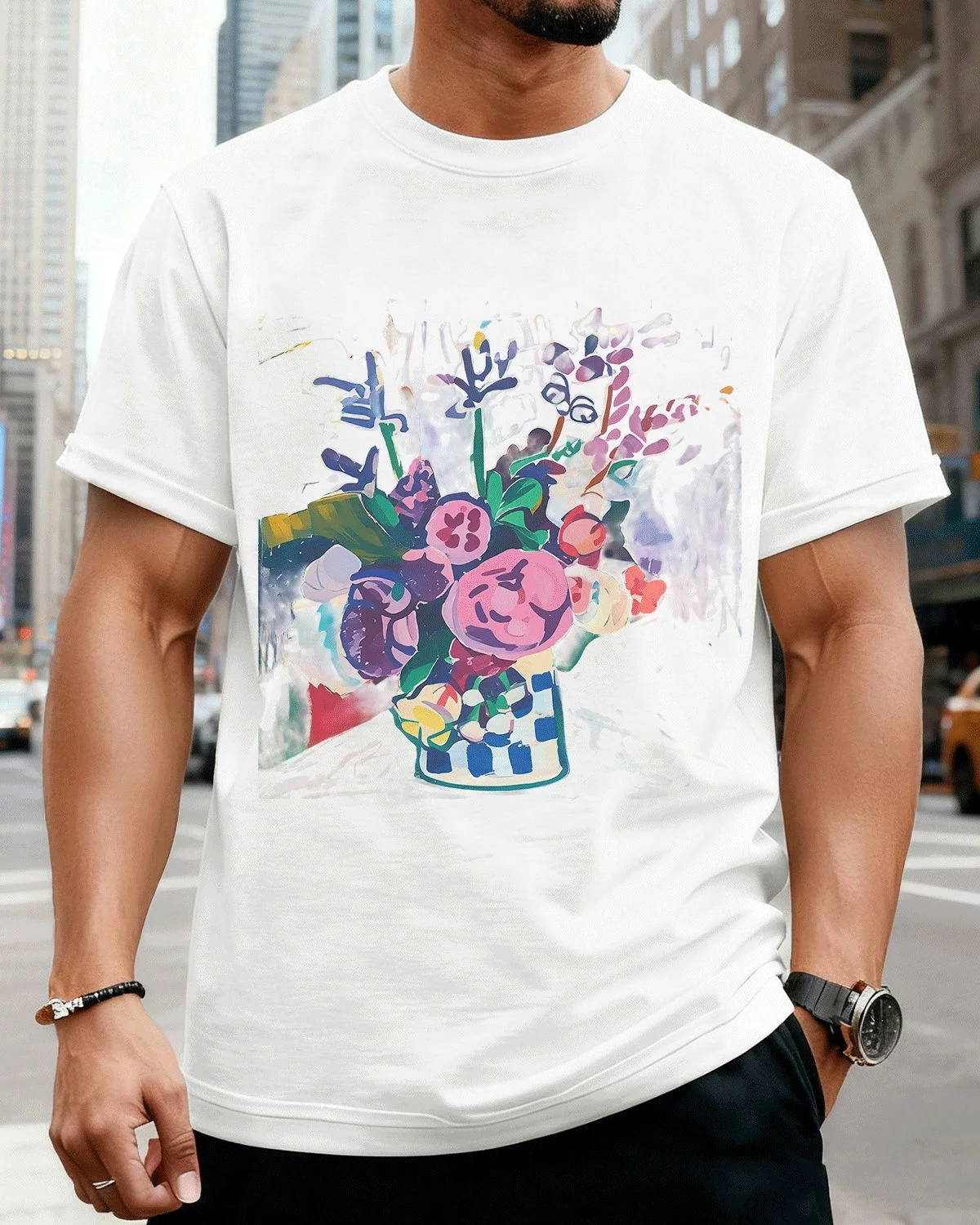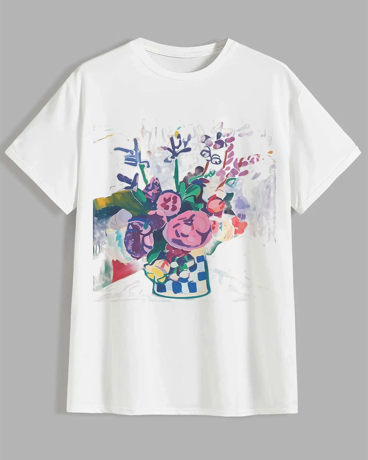 Colorful Abstract Flower Vase Summer Cotton Graphic T Shirt - Artistic Vintage,Short Sleeve,Soft Fabric,Comfortable Fit