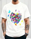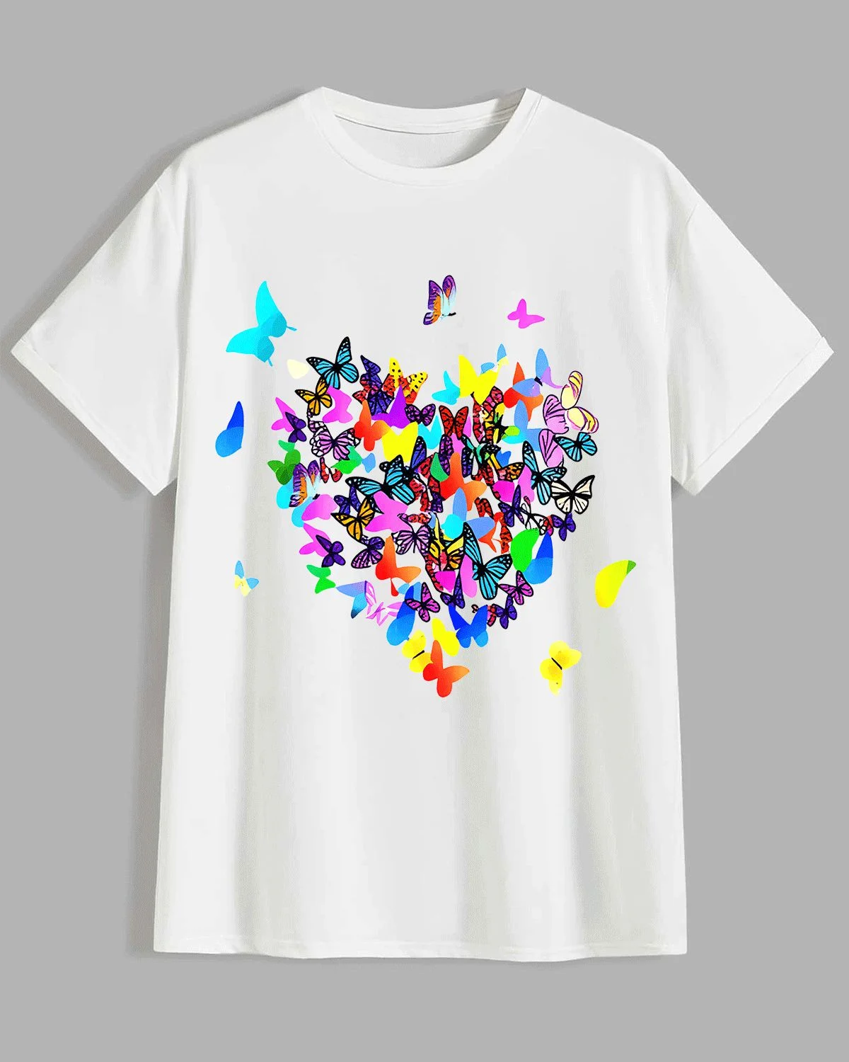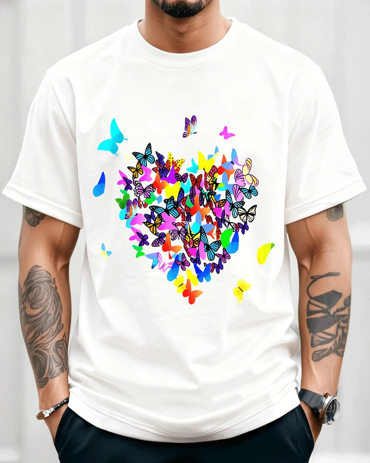 Colorful Butterflies Heart Summer Cotton Graphic T Shirt - Artistic Vintage, Short Sleeve, Soft Fabric, Comfortable Fit