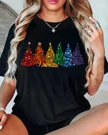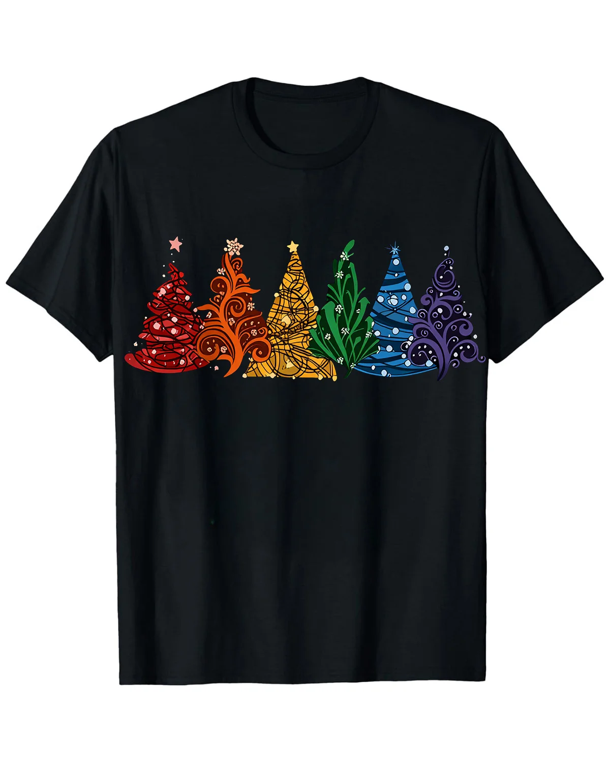 Colorful Christmas Trees Summer Cotton Graphic T Shirt-Casual Artistic,Short Sleeve,Soft Fabric,Comfortable Fit