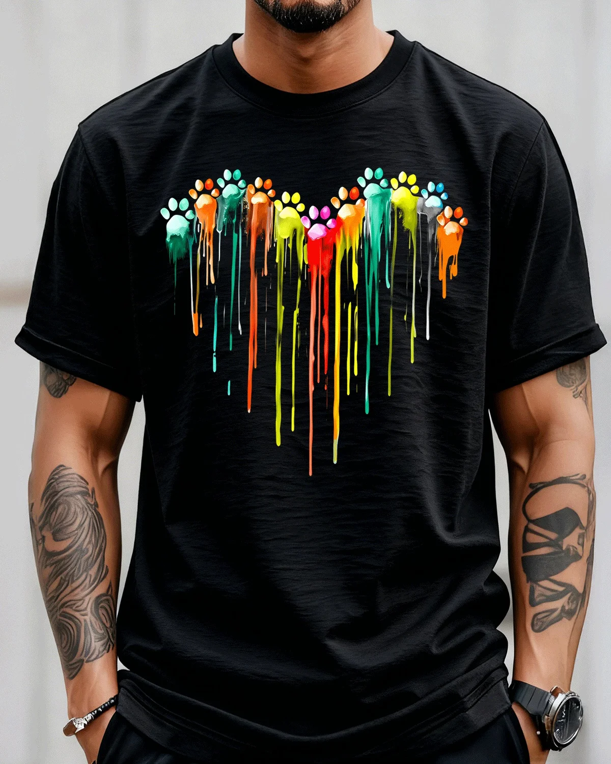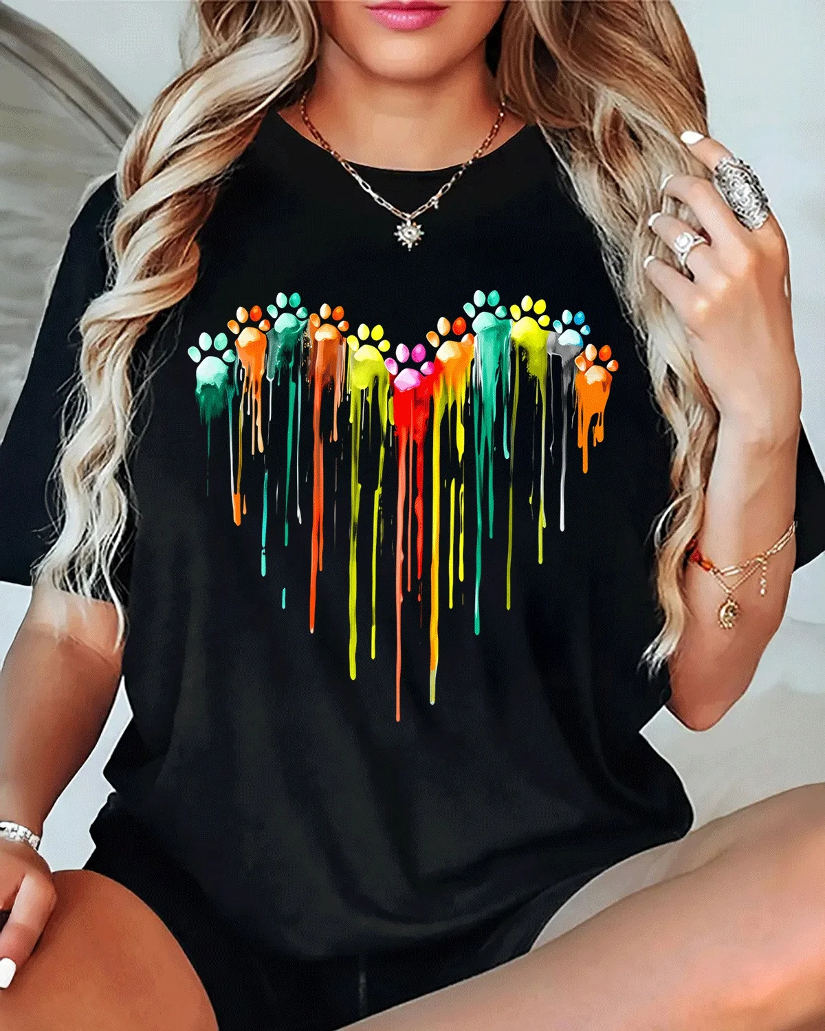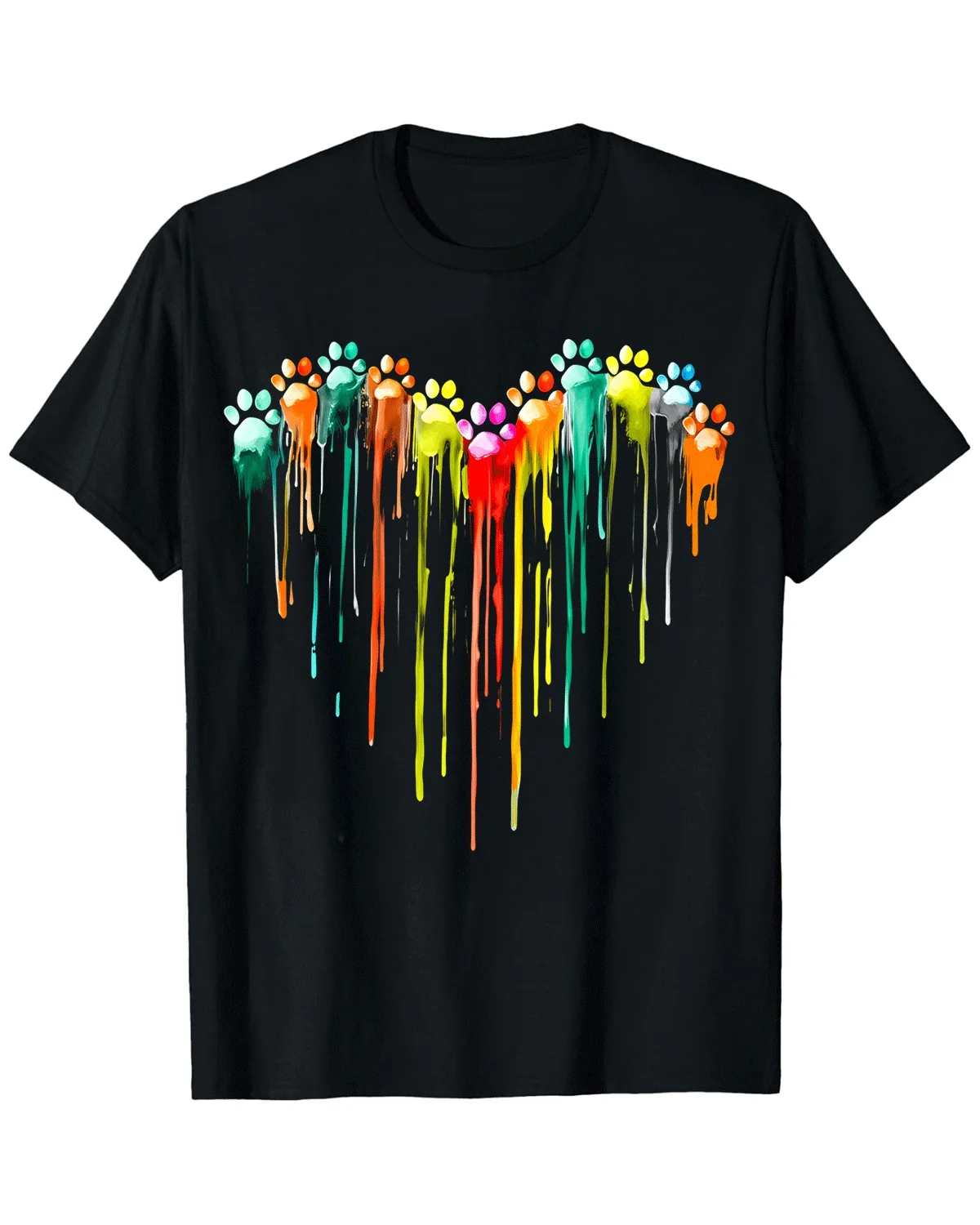 Colorful Dripping Paw Prints Heart Summer Cotton Graphic T Shirt-Artistic Casual,Short Sleeve,Soft Fabric,Comfortable Fit