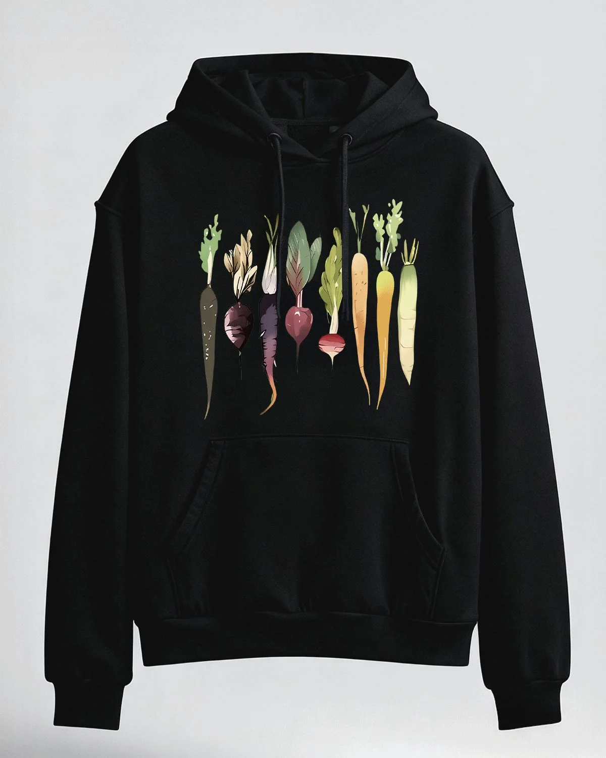 Colorful Root Vegetables Illustration Cozy Graphic Hoodie for Men and Women - Casual Artistic, Long Sleeve, Soft Fabric, Comfortable Fit