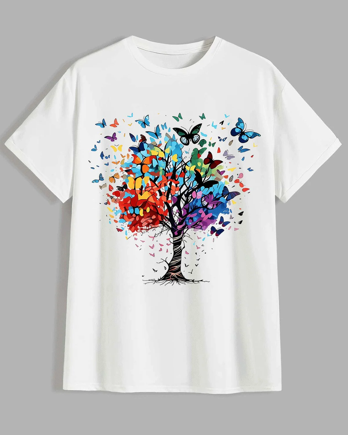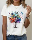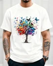 Colorful Tree with Flying Butterflies Summer Cotton Graphic T Shirt - Artistic Vintage, Short Sleeve, Soft Fabric, Comfortable Fit