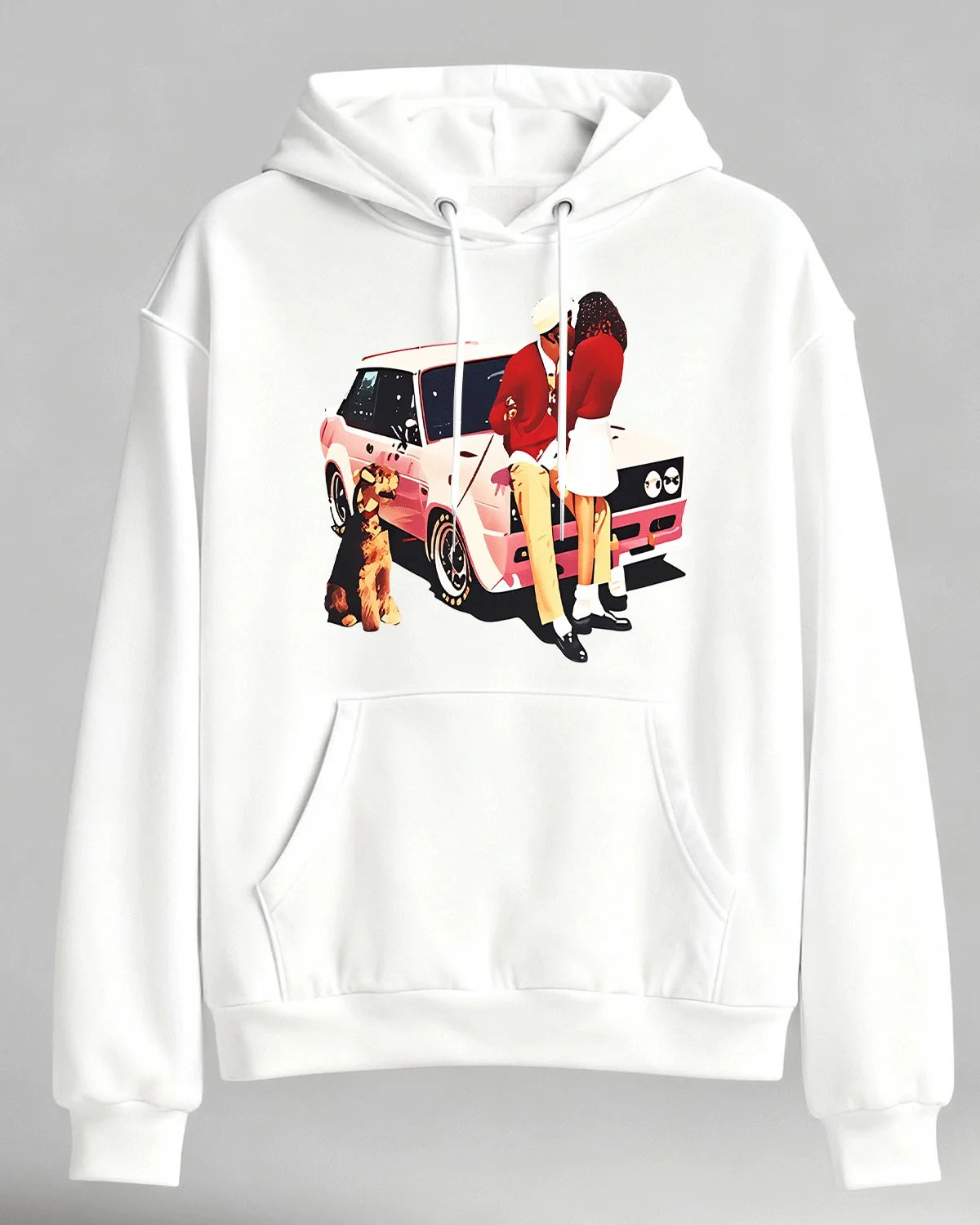 Couple Kissing by Retro Car with Dog Cozy Graphic Hoodie for Men and Women - Vintage Artistic, Long Sleeve, Soft Fabric, Comfortable Fit