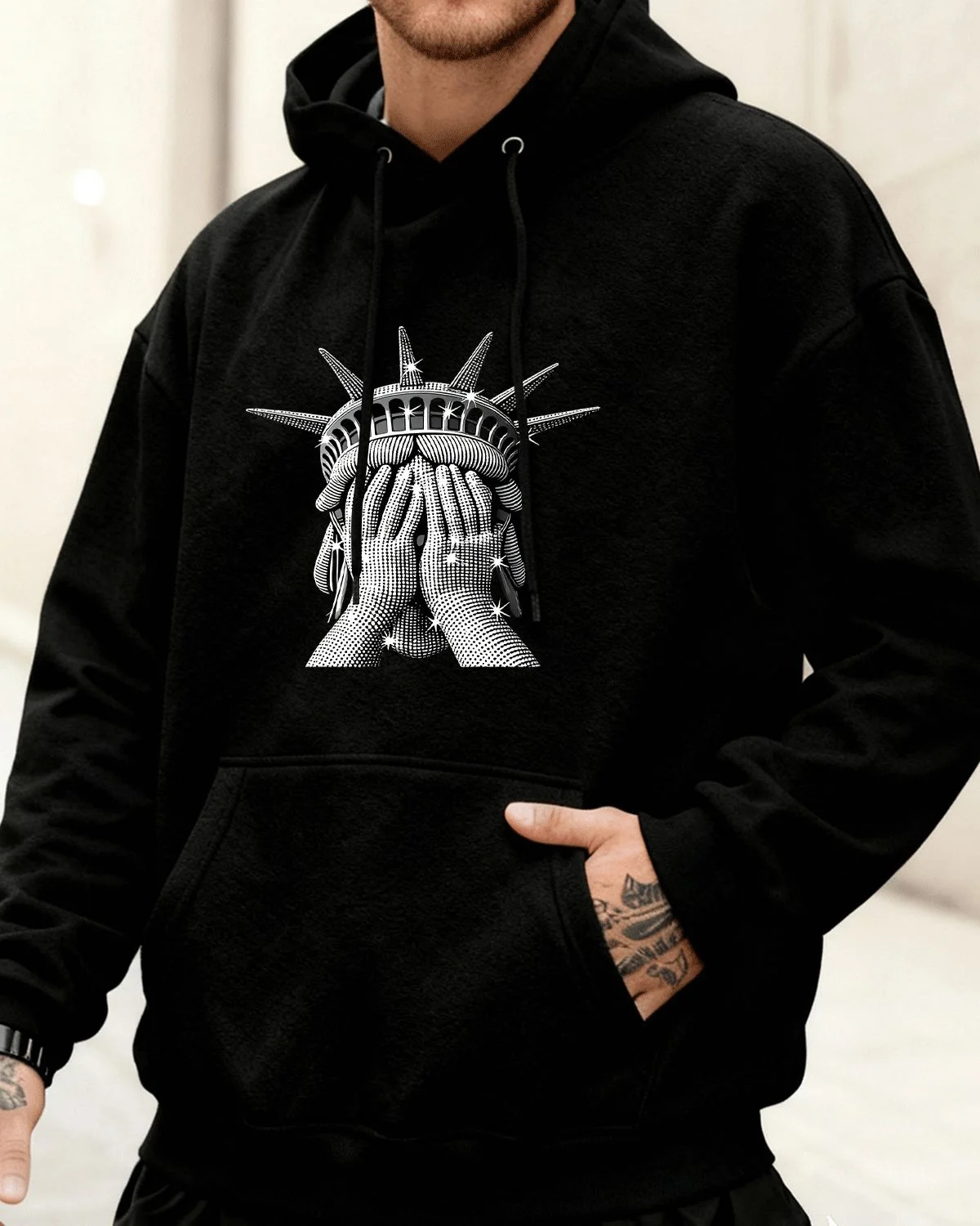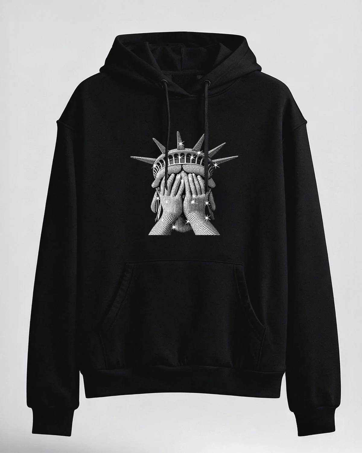 Crying Statue of Liberty Cozy Cotton Graphic Hoodie with Pocket-Artistic Retro,Long Sleeve,Soft Fabric,Comfortable Fit