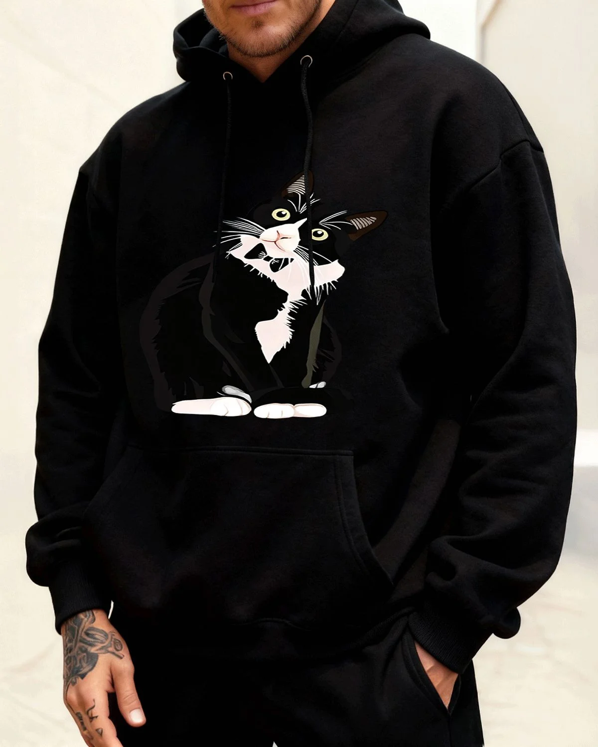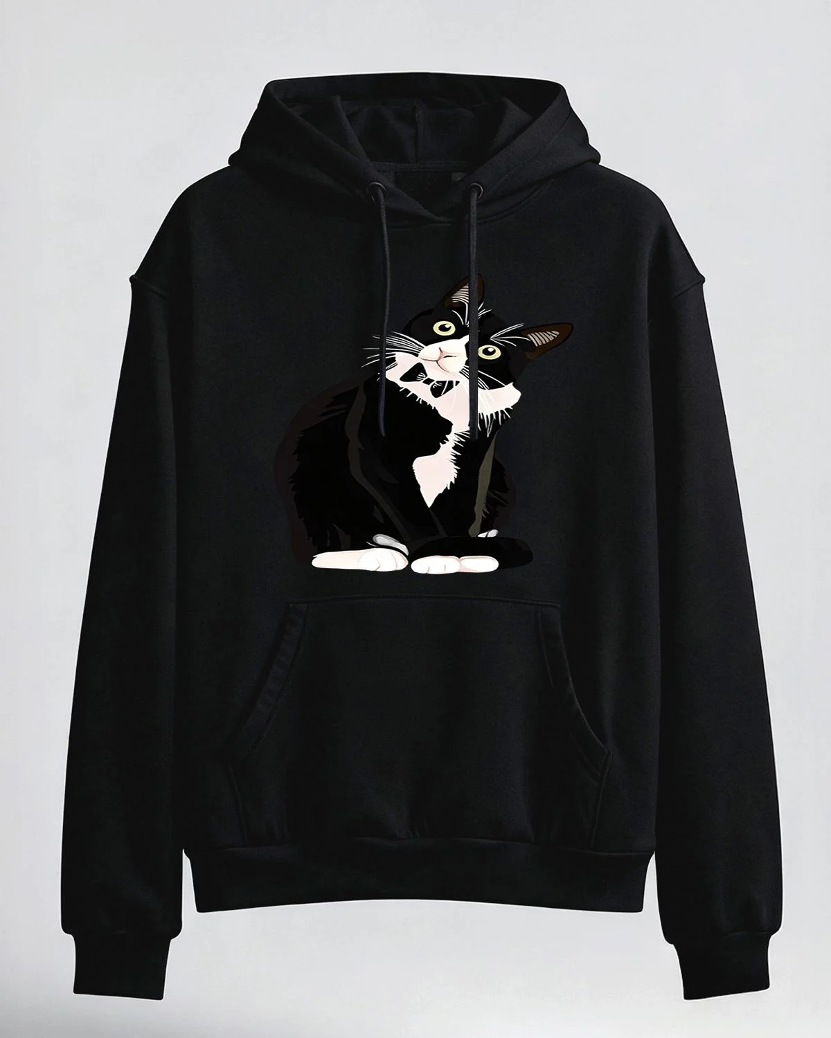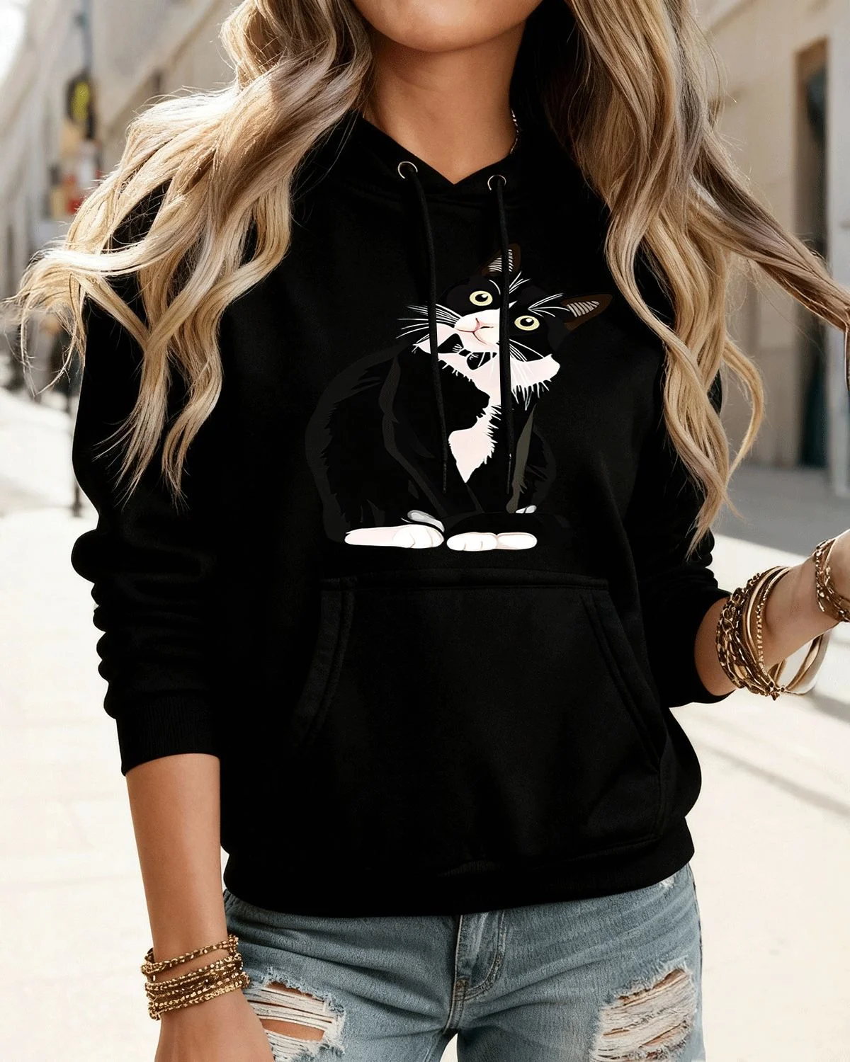 Curious Black and White Cat Summer Cozy Graphic Hoodie-Casual Artistic,Long Sleeve,Soft Fabric,Comfortable Fit