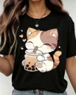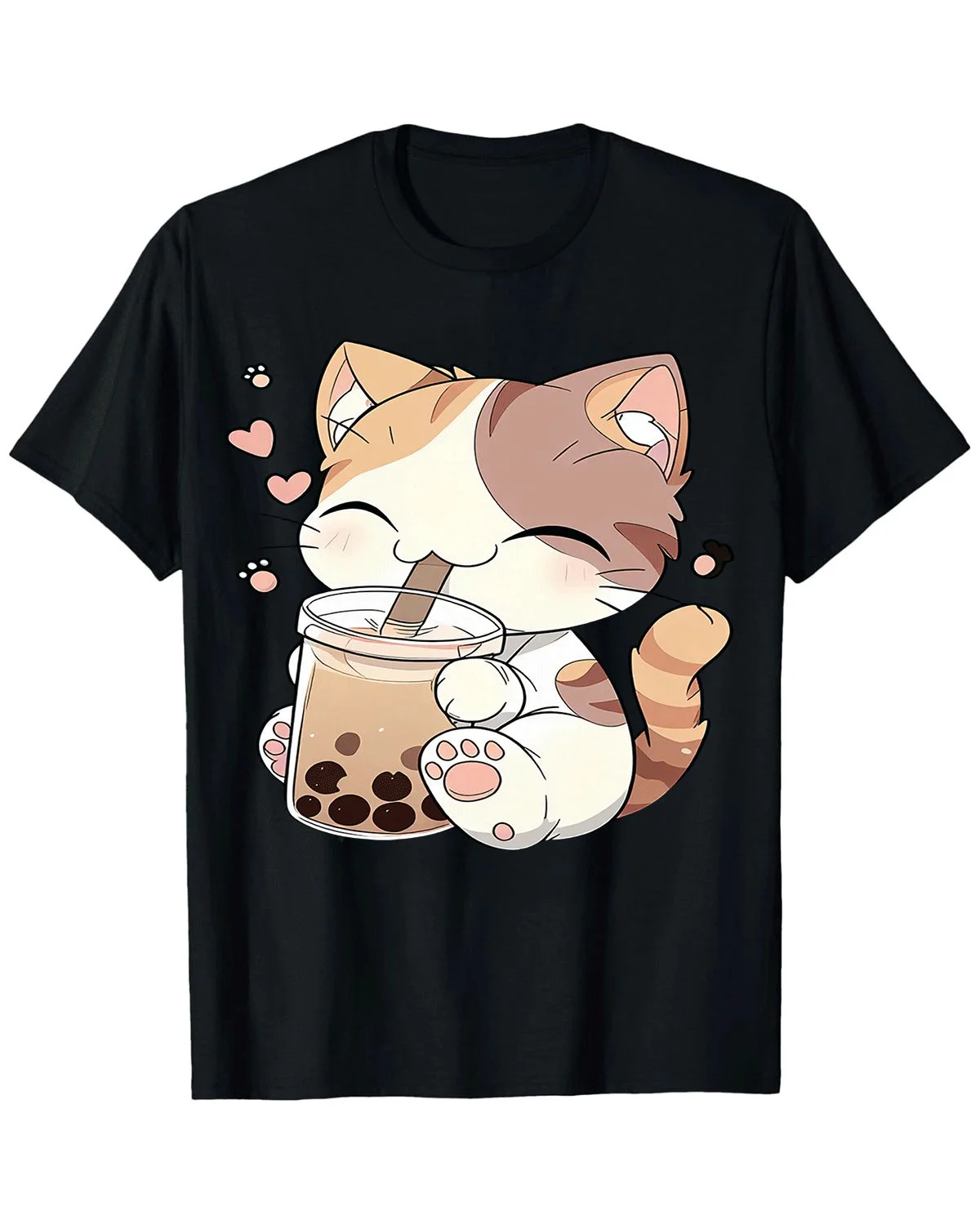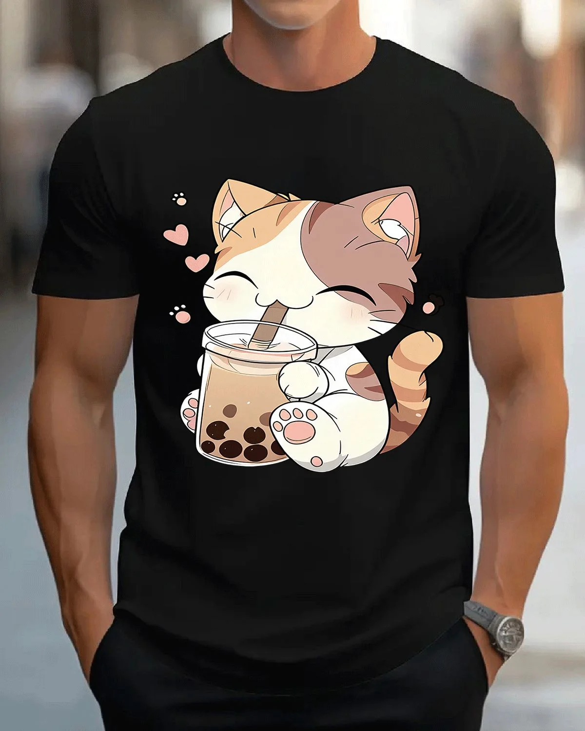 Cute Cat Drinking Bubble Tea Summer Cotton Graphic T Shirt - Casual Funny, Short Sleeve, Soft Fabric, Comfortable Fit