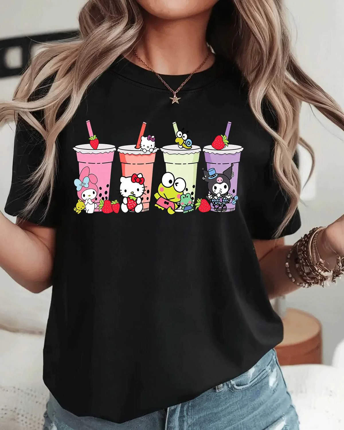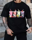 Cute Characters Strawberry Bubble Tea Summer Cotton Graphic T Shirt-Casual Trendy,Short Sleeve,Soft Fabric,Comfortable Fit