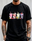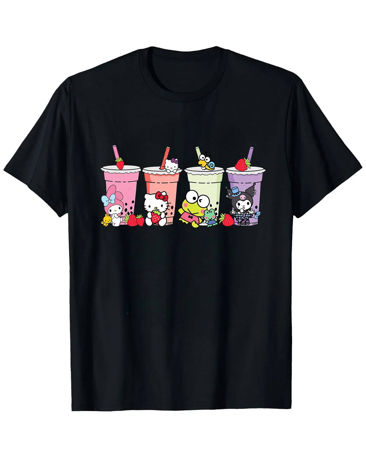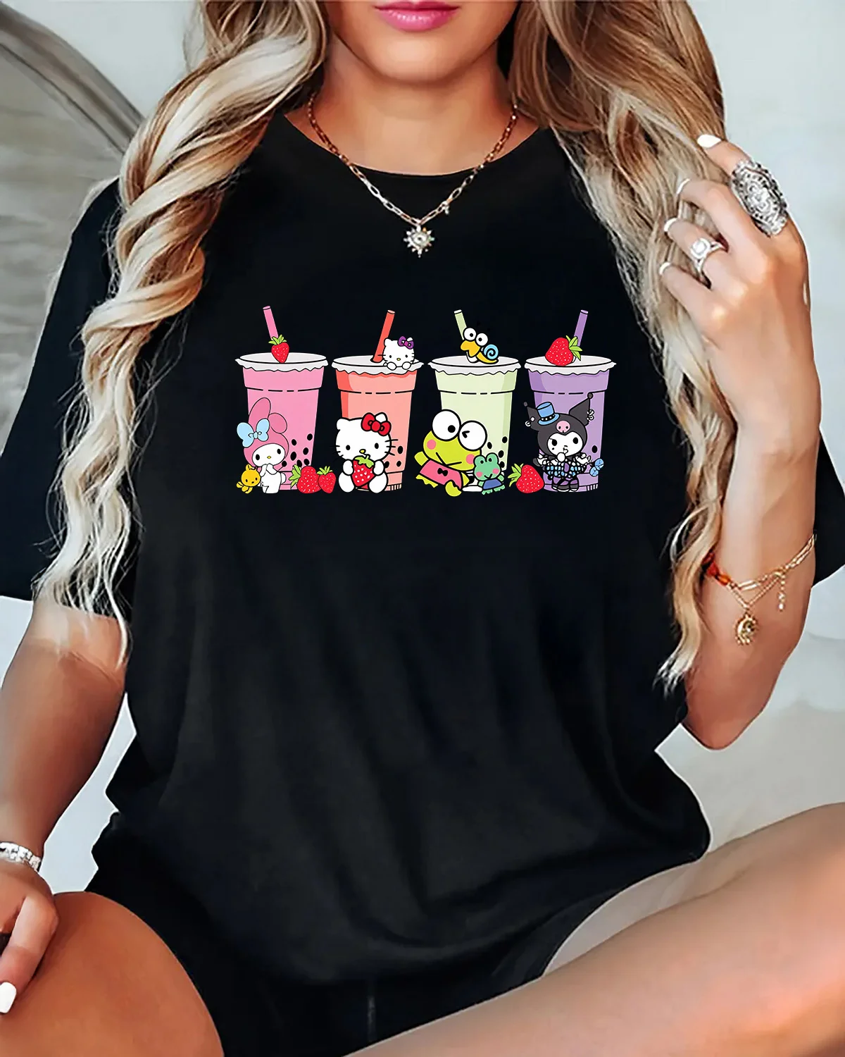 Cute Sanrio Characters with Bubble Tea Summer Cotton Graphic T Shirt-Casual Trendy,Short Sleeve,Soft Fabric,Comfortable Fit